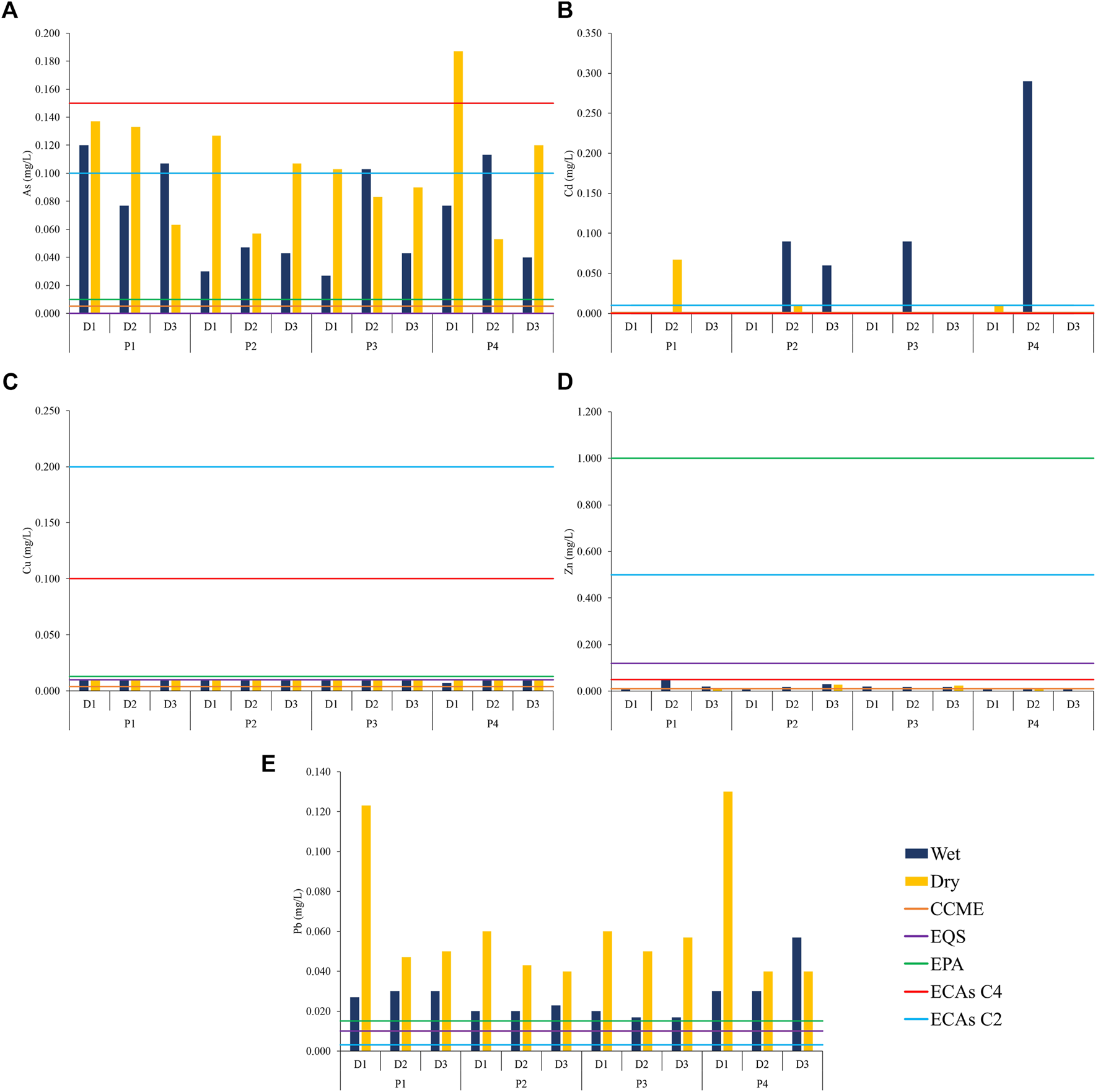 FIGURE 3. Concentration of metals and metalloids in the water and its contrast with international standards and the Peruvian standard. Arsenic (A), cadmium (B), copper (C), zinc (D), and lead (E). (CCME: Canadian standard set by the ministers of the environment for the protection of aquatic life (CCME, 2007); EQS: international standards established by the European Union for environmental quality in the field of water policy (EU, 2008); USEPA: National Primary Drinking Water Regulations (EPA, 2009); ECAs C2 and C4: National Environmental Water Quality Standards of Peru, for the category of conservation of the aquatic environment and the category of extraction and cultivation of hydrobiological species in lakes or lagoons (MINAM, 2017)).