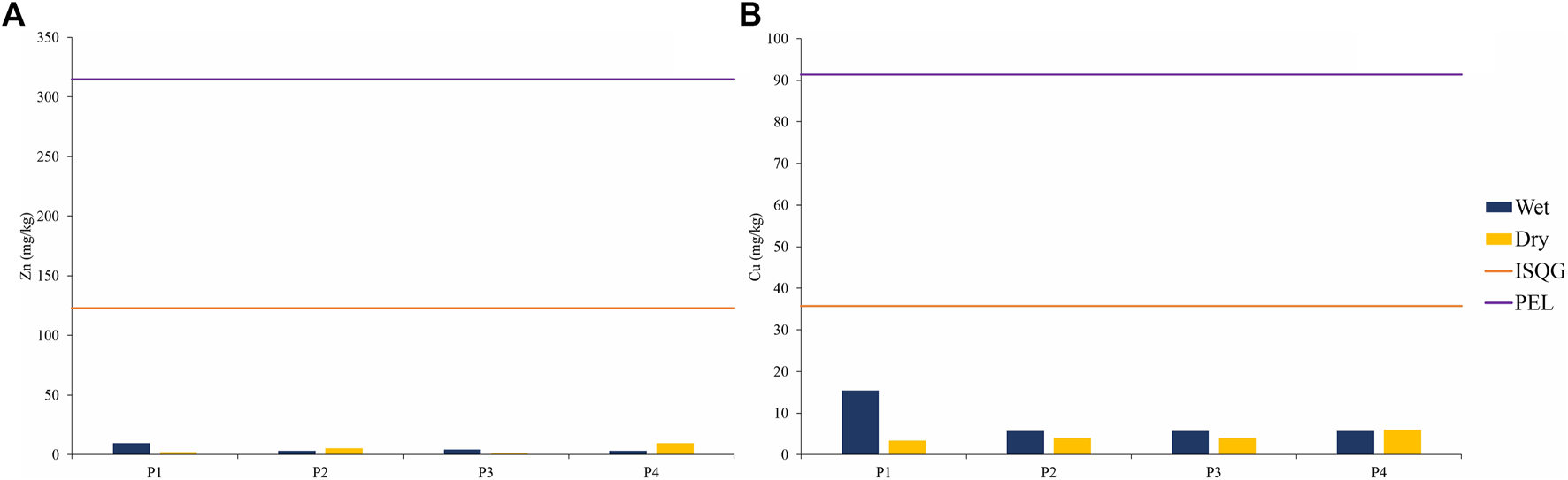 FIGURE 4. Concentration of zinc (A) and copper (B) in sediments and their contrast to the international standard: (CEQG: Canadian sediment quality standard for the protection of aquatic life in fresh waters (CCME, 2001), ISQG: interim freshwater sediment quality guidelines; PEL: probable effect level).