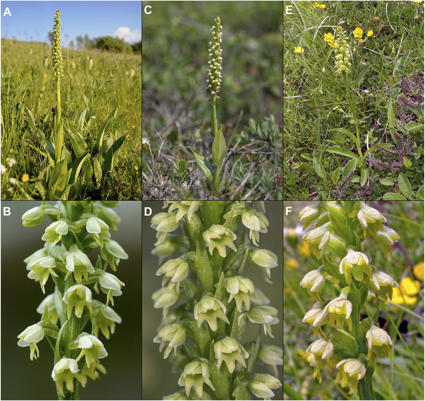 Photographs of the small-white orchid in its natural habitat. Pseudorchis albida ssp. albida in Rhön, Germany (A), and Zillertal Alps, Austria [(B); photographer: Marco Klüber/www.m-klueber.de], Pseudorchis albida ssp. straminea in Newfoundland, Canada [(C,D); photographer: James Fowler], and Pseudorchis albida ssp. tricuspis on Mt. Mangart, Julian Alps, Slovenia [(E,F); photographer: Amadej Trnkoczy].