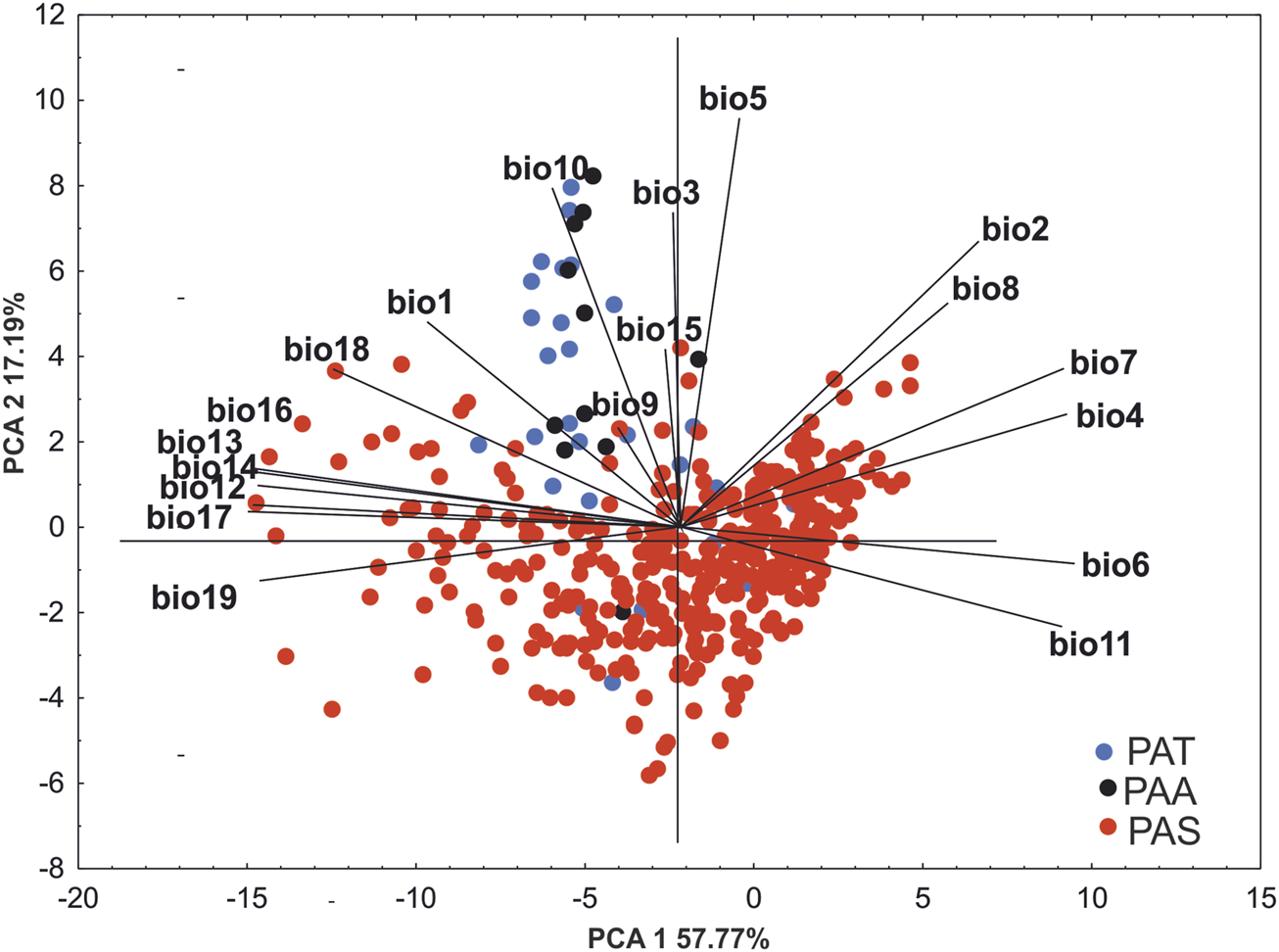 Principal components analysis (PCA) was used to evaluate the differences between populations of P. albida ssp. straminea, P. albida ssp. albida, and P. albida ssp. tricuspis based on 19 bioclimatic variables from WorldClim v. 2.1 (Table 1; Fick and Hijmans, 2017). Calculations were carried out using the software package Statistica PL. ver. 13.3 (StatSoft Inc. 2011). The data matrix was transformed (square root) before carrying out the ordination analysis.