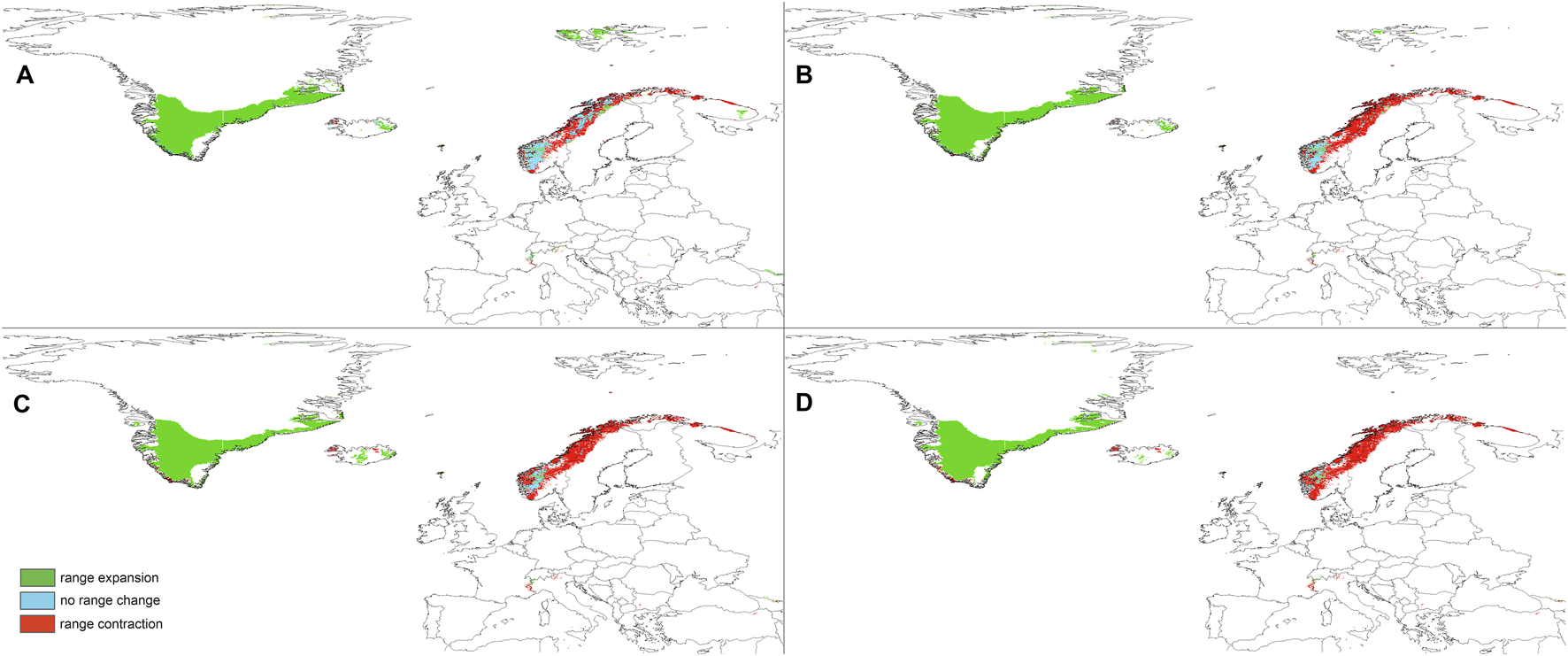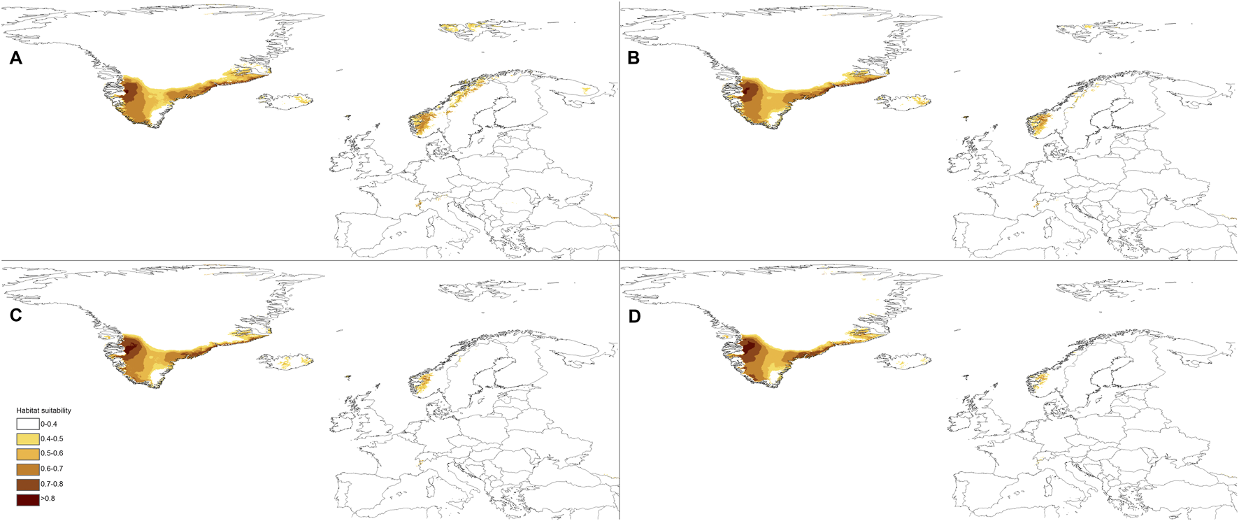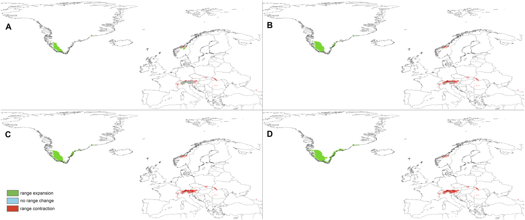 The predictions of the present-time models are congruent with the known geographical ranges of P. albida ssp. albida and P. albida ssp. straminea (Figure 3). Our analyses indicate the critical changes in the distribution of small-white orchid (Figures 4–7). All models predict that the availability of suitable niches for the orchids studied will increase as a result of global warming (Table 3), but the significant increase in suitable niches is expected to occur in Greenland, whereas habitat loss in continental Europe will be severe. Overall, the potential range of P. albida ssp. albida will be 27%–88% greater than at present, whereas that of P. albida ssp. straminea will be 88%–156% greater. The unexpected result is that while SSP1-2.6 is expected to be the most advantageous climate change scenario for the latter taxon, the same scenario is the least optimistic for P. albida ssp. albida, which will mostly benefit from SSP5-8.5.