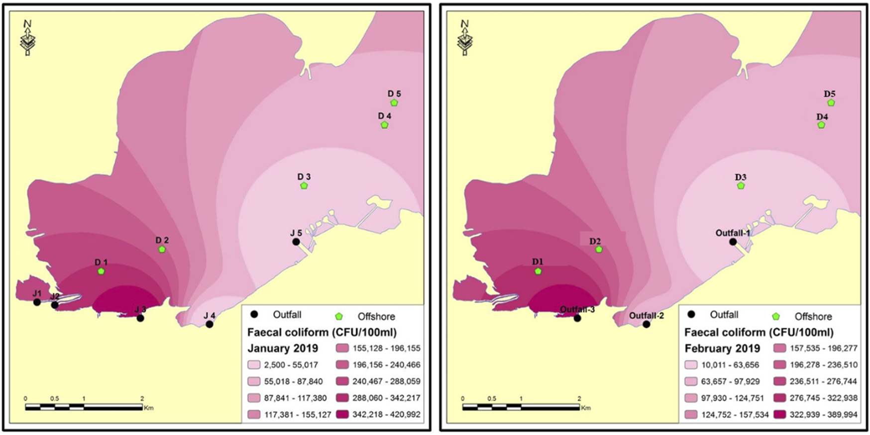 Furthermore, high concentrations of nutrients, trace metals, and other dissolved and particulate matter are evident in DB (Devlin et al., 2015). Several studies (Al-Muzaini et al., 1999; Al-Mutairi et al., 2014; Al-Mutairi et al., 2015) described DB as the most heavily affected area of KB by pollutants. However, to our knowledge, no previous studies are available that focus solely on DB and specify the type of the pollutants and their sources. The study fills this gap, investigates the fate of untreated wastewater from the treatment plants, and determines the distribution of pollution levels of different microbial indicators within the bay. To date, information on the potential impacts of the coastal outfalls on water quality in neighboring areas and offshore is insufficient and difficult to access. This study highlights the impact of environmental stressors on the health of such bays. Also, the study assesses the spreading of the pollutant relative to the location of the pollution source. The study focuses on examining microbiological pollution indicators (fecal coliform, E. coli, and fecal streptococci) and their distribution within DB and studying the distribution of microbiological indicators from the source (outfalls) to offshore.