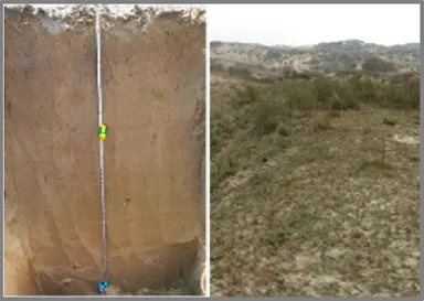 Due to the significant differences in the soil moisture conditions in the parts with differing topography in the dune depression interphase area, the distributions and growth of natural vegetation and crops are significantly different. To explore the crop site conditions in areas with differing topography and to then determine a reasonable design, two observational cross-section transects were selected, which are located on an undeveloped natural dune depression slope and on an adjacent slope that has been developed as a farmland dune depression slope. In addition, we extend from the greatest heights of the dune depressions in the two cross-section belts down to the depressions and select sampling points in different parts as the representatives of various dune depression landforms in the project area to measure the soil properties and monitor the water dynamics. See Table 1 below for a comparison of the sampling points.