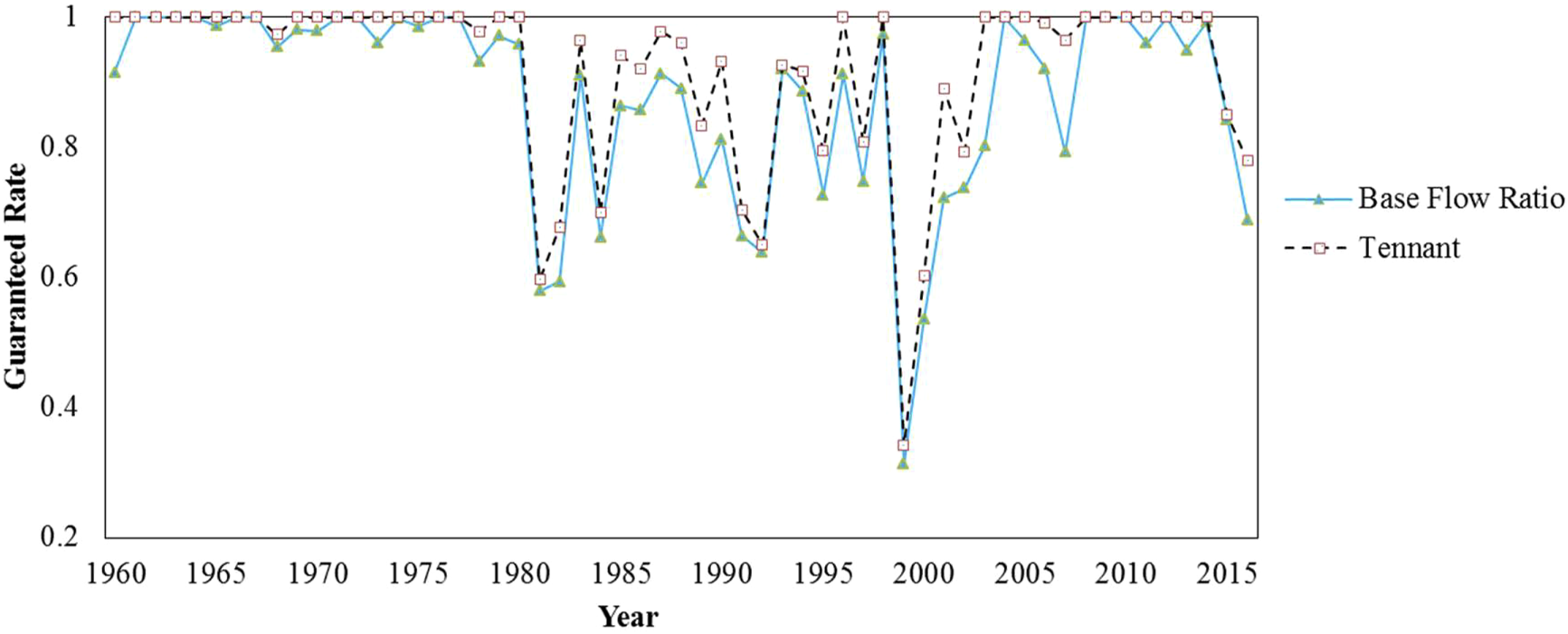 Guaranteed rate of ecological base flow of each month by base flow ratio method and tennant method.