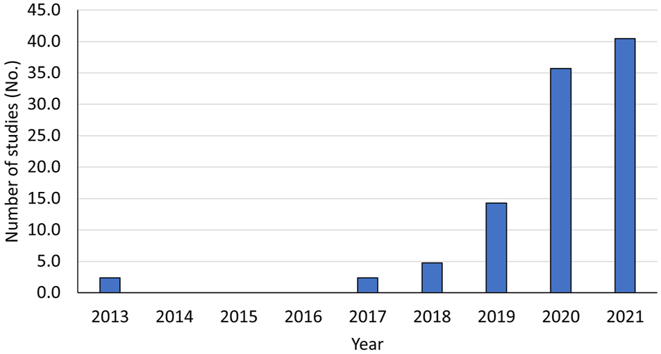 Research on MA in riverine ecosystems started in 2013, with exponential growth from 2017 to 2021 (Figure 3). In particular, we found a significant positive association between the publication year and the number of studies (rs = 0.85, p < 0.05; Figure 3). In these 4 years (from 2017 to 2021), the number of articles on plastics has increased as shown in Figure 3, and although studies on MP skyrocketed from 76 to 95%, increasing considerably, the number of studies on MA has also risen considerably.