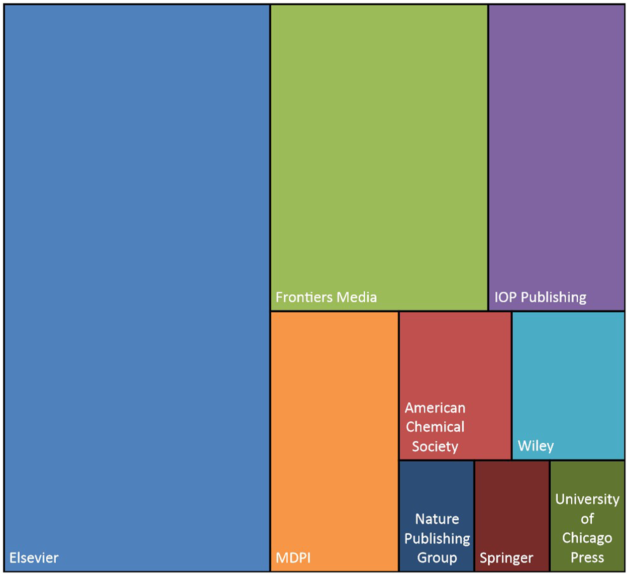 Most of studies were published on Environmental Pollution (14.3%), Marine Pollution Bulletin and Science of the Total Environment (both 11.9% each one), and Environmental Research Letters, and Frontiers in Earth Science and Frontiers in Marine Science (all these ones accounting for 7.1% itself). About publishers, Elsevier (42.9%), Frontiers Media (19.0%), IOP Publishing (11.9%), and MDPI (9.5%) are the main ones (Figure 4). Among articles, open access, gold, green (53.7%), not open access (29.3%), hybrid (9.8%), and bronze open access (7.3%) are the most frequently occurring publishing ways. In general, the topic of MA, although understudied, is recently getting more attention as MA may cause several concerns at different biological levels, such as MP; thus, these well-published journals noticed this problem, and so they decided to publish more on this. Indeed, plastics are a significant phenomenon getting more attention, so journals face this topic in this period. In more detail, the difference between editors is not a pivotal role since we have to consider that several publishers are publishing on this topic as it is a well-recognized problem.