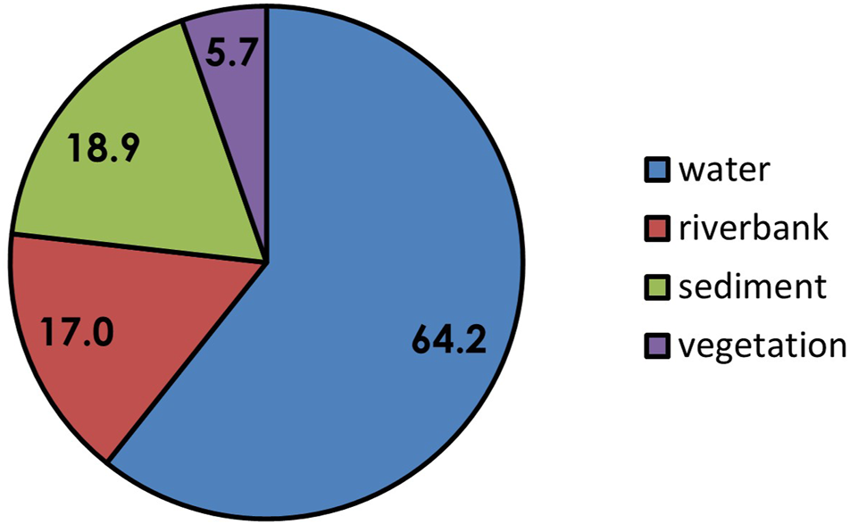 Frequency of studies (%) for macroplastics in rivers conducted on several matrices.