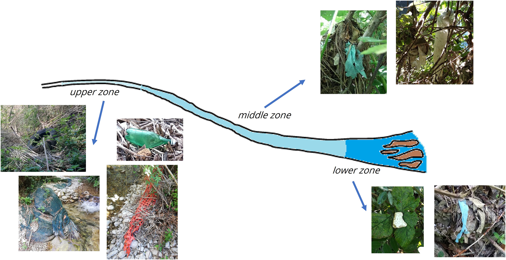 Compared with literature, our MA trend along the river zones follows that stated by Gallitelli et al. (2020) for MP in rivers. In that case, MP concentration in water increased from spring to the mouth of river Mignone in central Italy (Gallitelli et al., 2020). Finally, our findings can provide information on the source of plastic pollution. In fact, in this case, we observed that great size (i.e., macro) and mismanaged plastic waste dominated the highest parts of rivers.