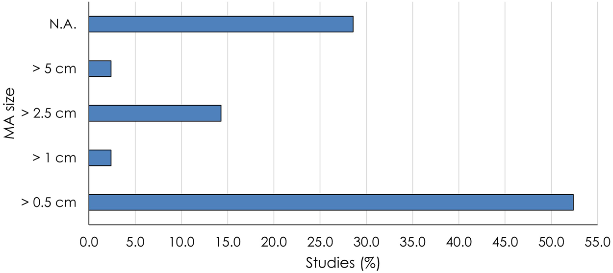 Threshold for macroplastic (MA) size adopted in different studies (%). N.A. represents the studies in which the threshold size was not assessed.