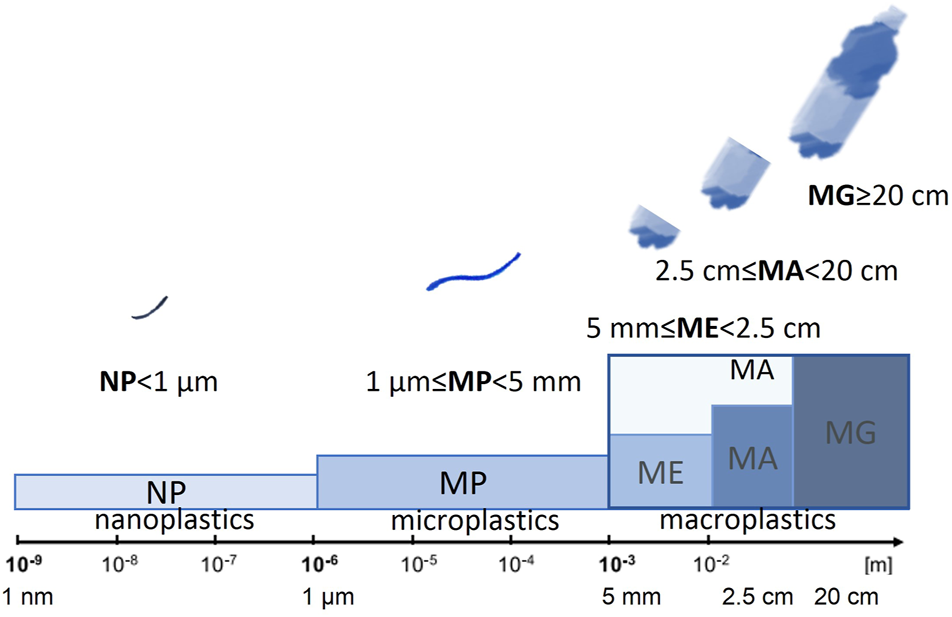 New nomenclature proposal of plastic classification (by Hartmann et al., 2019, modified). NP = nanoplastics; MP = microplastics; ME = mesoplastics; MA = macroplastics; MG = megaplastics. Note that ME, MA, and MG reported in the literature are all grouped within MA in this review.