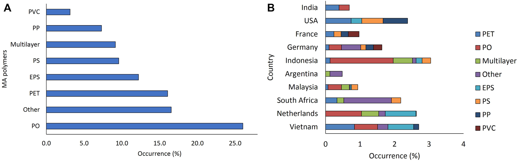 Most occurring macroplastic (MA) polymers (A) in rivers worldwide among countries (B).