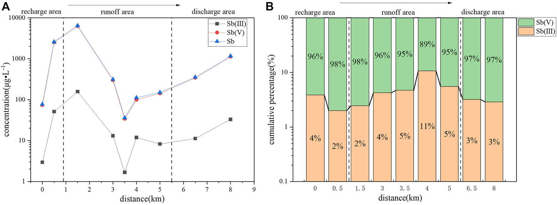 As shown in Table 2 and Figure 5, the Sb(V) contents in the recharge, runoff, and discharge areas were higher than those of Sb(III), suggesting that D3x4 water was dominated by Sb(V). The spatial distribution of Sb (Figure 5A) revealed that, along with the groundwater flow, the contents of Sb(III), Sb(V), and Sb first increased, then decreased, and then increased again. The changing trends of Sb and Sb(V) were similar, indicating that the geochemical behavior of Sb was mainly controlled by Sb(V).
