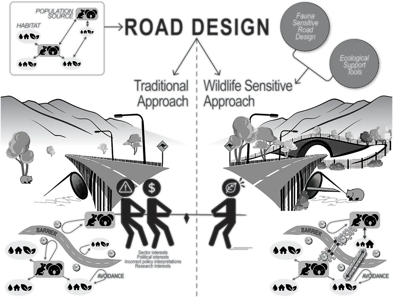 Road ecology is a recent sub-field that sits at the intersection of environmental science and engineering. Much of this research is, however, focused on greenhouse gas emissions and pollution (Li et al., 2014; Pang et al., 2021), technological innovations (Cai et al., 2022; Yu and Wan, 2022), and broad ecological impacts (Liu et al., 2010). Few studies have examined the broader impacts of transportation infrastructure planning and design on wildlife and targeted mitigation measures for these. Fauna-sensitive road design (FSRD) is a tool for transport policy that acknowledges the negative impacts of roads on wildlife and seeks ways, through modifications to road design, that facilitate the safe and natural movement of wildlife across roads (Iuell et al., 2003; van der Ree et al., 2015b). Although costly, such modifications are highly successful in mitigating the road impacts on wildlife (Iuell et al., 2003; van der Ree et al., 2015a). Ecological research in general, however, has had very little impact on transportation planning and management, in part due to the demand for transport practitioners to achieve political and community values (Bond et al., 2014; Marsden and Reardon, 2017; Akgün et al., 2019). This has culminated in an applied field of research narrowly focused on technological solutions (Geerlings and Stead, 2003; Akgün et al., 2019).