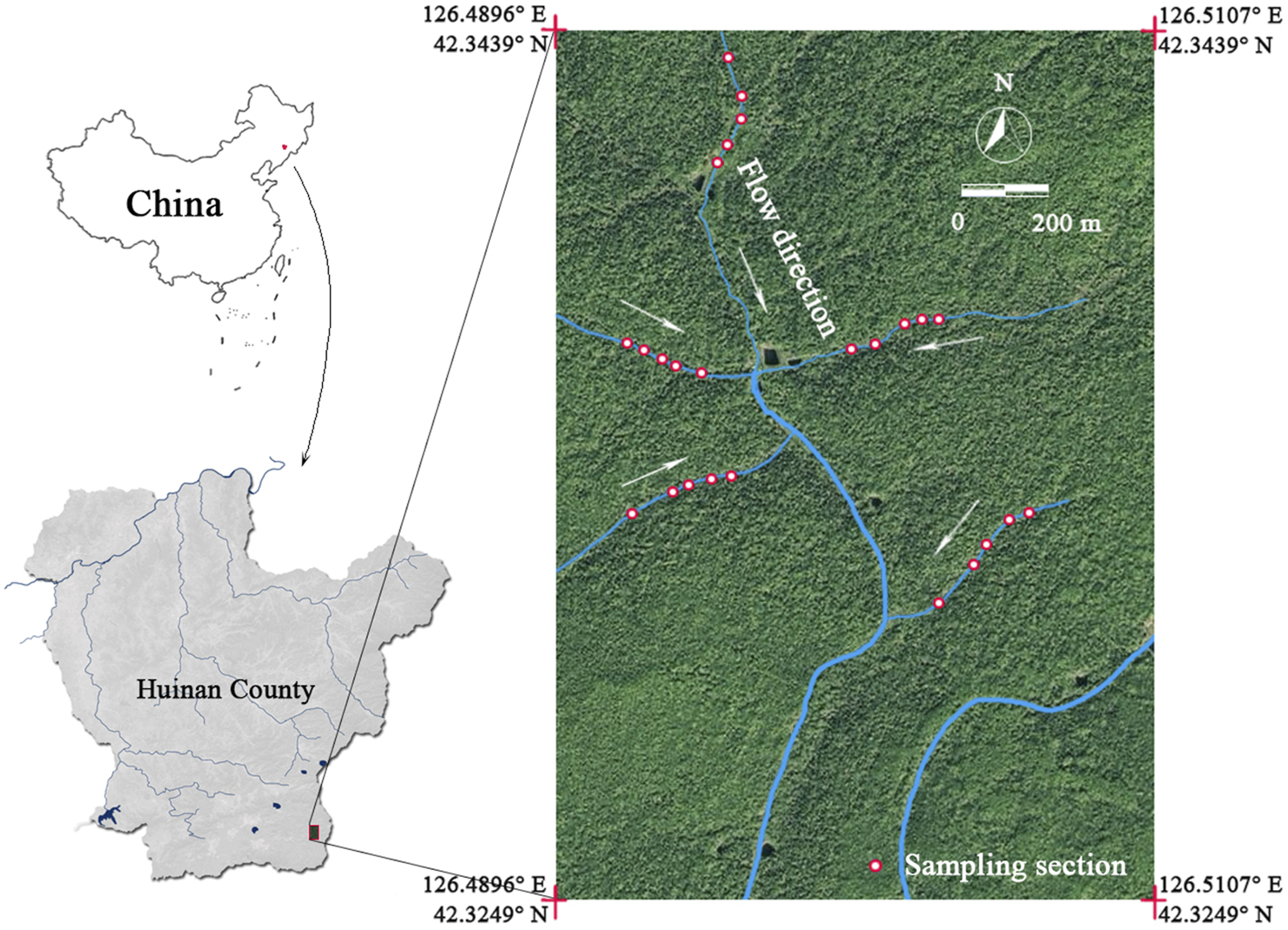 The experimental streams (42°19′41″-42°20′13″N, 126°28′41″-126°30′22″E, 760–776 m a.s.l.) were located in Longwan National Nature Reserve, Huinan County, Jilin Province, China. The area has a northern temperate continental monsoon climate with a mean annual precipitation of 704.2 mm, mean annual water temperature of 7°C, and a monthly water temperature range of 0.5°C in January to 15°C in July (Wang et al., 2019). The freezing and snowmelt periods in this area occur from late November to late March of the following year, and from early to late April, respectively.