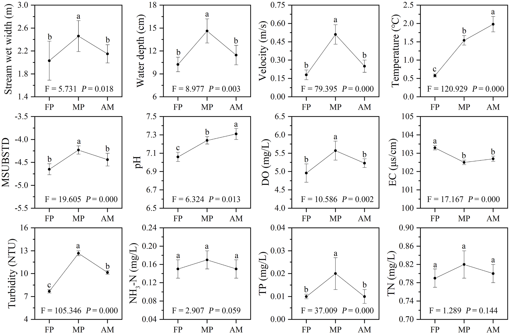 All measured stream physiochemical characteristics showed temporal changes except for TN and NH3-N (Figure 2). Stream wet width, water depth, flow velocity, DO, MSUBSTD, turbidity, and TP were higher during MP than in the other two periods. Water temperature and pH shared the same trend: the two indices were the lowest in the FP and highest in the AM. In contrast, EC was higher in the FP than in the other two periods.