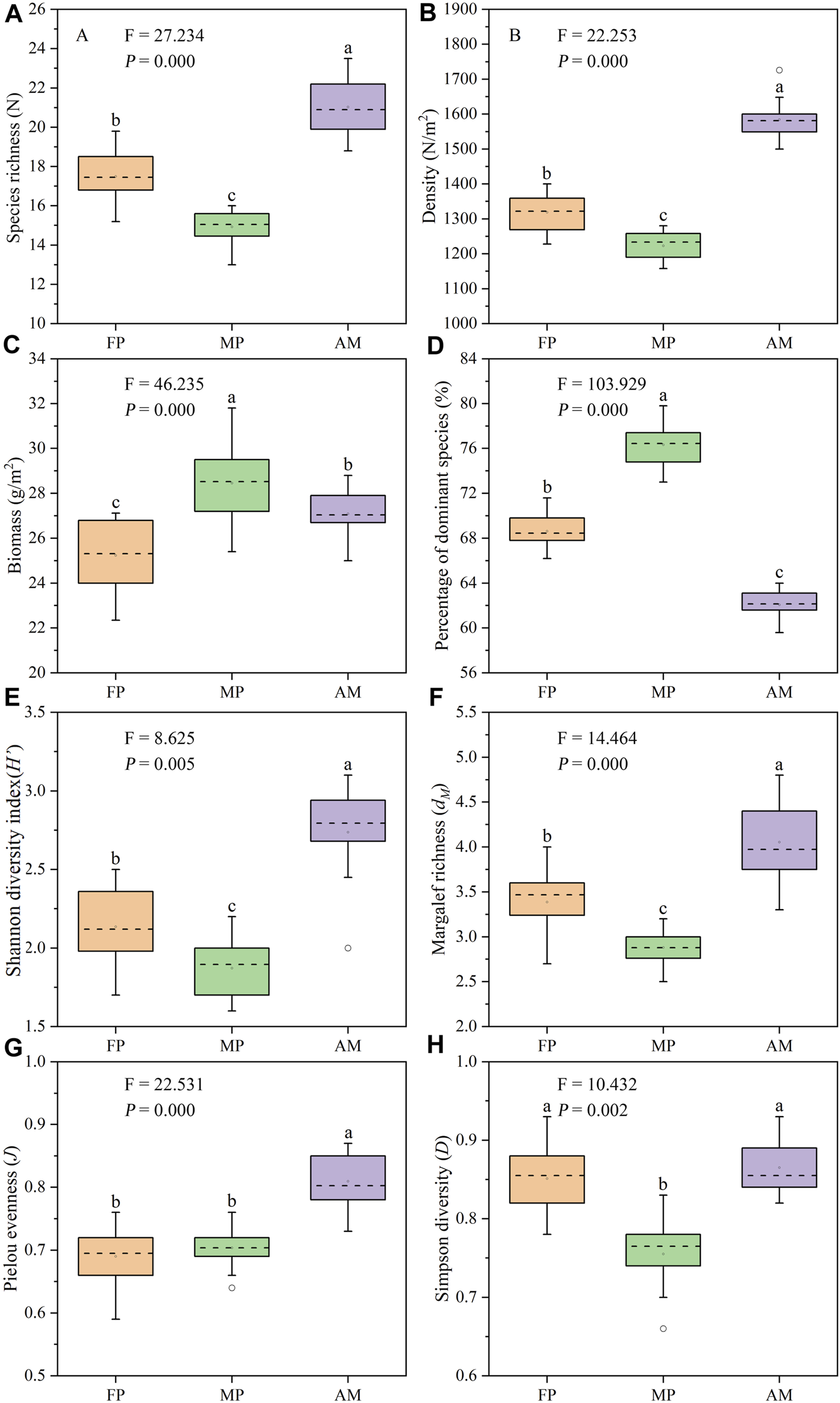Temporal (FP, freezing period; MP, melting period; AM, after the melting period) changes of macroinvertebrate species richness (A), density (B), biomass (C), and proportion of dominant species (D) of stream macroinvertebrate species in three periods of snow melting, Shannon diversity index (E), Margalef diversity (F), Pielou evenness (G), and Simpson diversity (H). Box plots indicated interquartile ranges (box part), 25th and 75th percentiles (lower and upper error bars), and mean values (dash lines in the box). Different lowercase letters indicate significant differences in invertebrate community structure caused by different periods.