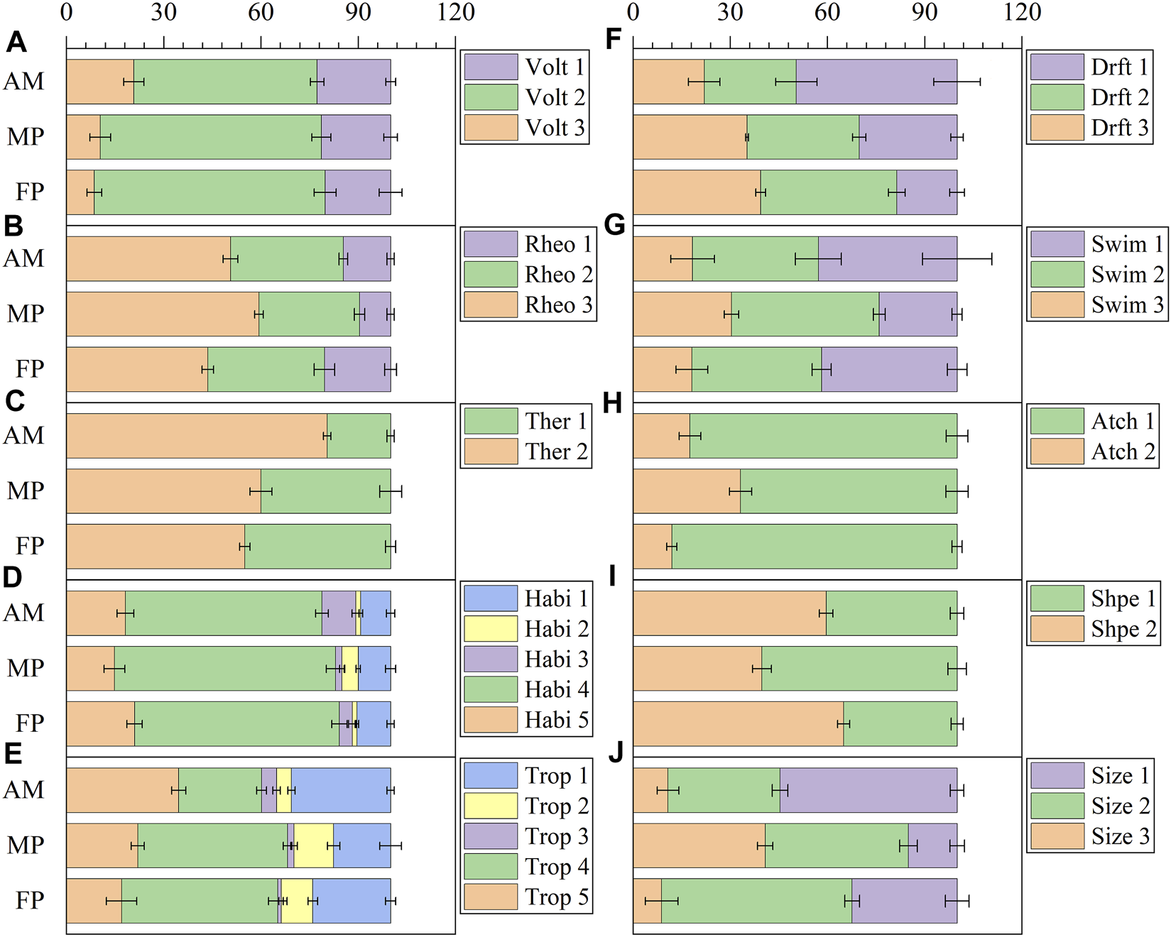 Regarding life history traits, the probability of " Bi-or multivoltine (Volt 3)" was higher in the AM than in the other two periods (p < 0.05, Figure 4A). From the perspective of ecological traits, the “erosional (Rheo 3)" macroinvertebrate characteristics were higher in the MP than in the other two periods. The proportion of taxa with the characteristics of “cool/warm eurythermal (Ther 2)” and “sprawl (Habi 3)” were higher in the AM than in the other two periods, while the proportion of “predators (Trop 4)” was significantly lower in the AM than in the other two periods (p < 0.05, Figures 4B–E). From the perspective of mobility traits, the proportion of macroinvertebrate taxa of “Rare occurrence in drift (Drft 1)" was higher in the AM than in the other two periods (p < 0.05, Figure 4F). The proportion of macroinvertebrate taxa with a “Strong swimming ability (swim 3)" trait was higher in the MP than in the other two periods (p < 0.05, Figure 4G). Regarding morphology traits, the proportion of macroinvertebrate taxa with “Some attachment (Atch 2)", “Streamlined shape (Shpe 1)", and “Large size at maturity (Size 3)" traits in the MP were significantly higher than in the AM and FP (p < 0.05, Figures 4H–J). The proportion of taxa of “Small size at maturity (Size 1)" traits were higher in the AM than in the other two periods (p < 0.05, Figure 4J).