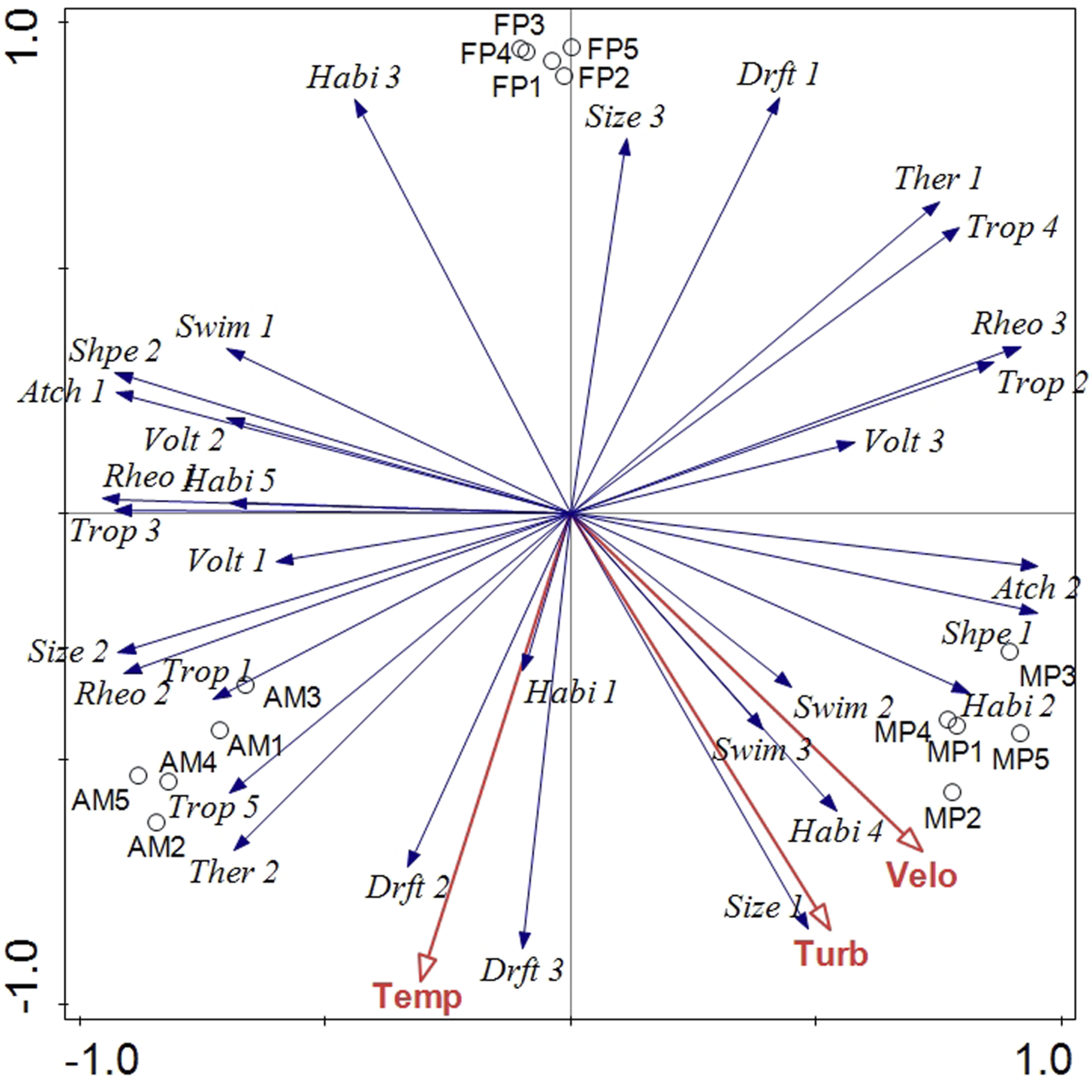 Redundancy analysis (RDA) ordination biplots of functional traits (blue arrows), sampling sites (black circles), and forward-selected environmental factors (red arrows) for three periods of melting ice and snow. The summary of ordination results is presented in Table 1 and the codes for each functional trait category are shown in Supplementary Table S1. Temp, Temperature; Turb, Turbidity; Velo, Velocity. FP, freezing period; MP, melting period; AM, after the melting period.