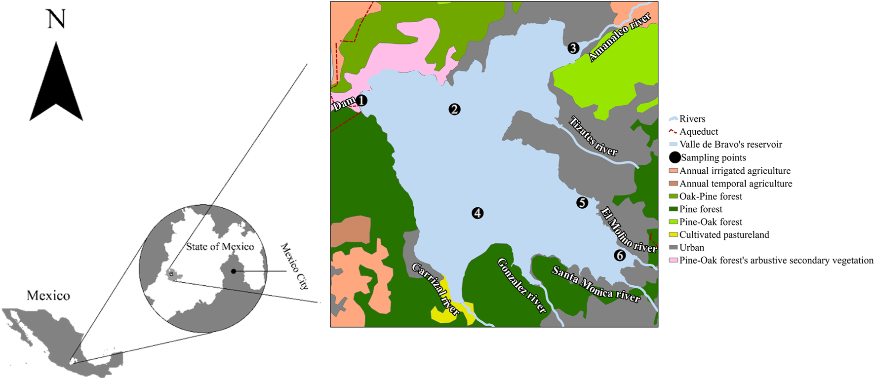 The Valle de Bravo reservoir (Figure 1) is located in the eponymous municipality, in the State of Mexico (19°21′30″ N, 100°11′00″ W). The climate is temperate sub-humid and semi-warm, with an average annual temperature greater than 18°C (Olvera, 1992) and average annual rainfall of 836 mm with a rainy season ranging from June to September. The topography is characterized by hills with plains. The vegetation is composed of mixed pine-oak forests, low deciduous forests, pastures, and seasonal agriculture (Olvera-Viascán et al., 1998). The body of water has an approximate surface of 18.55 km2, a maximum depth of 38.6 m (average of 21 m) and an average volume of 391 million m3 (Monroy, 2004). This is classified as a warm monomictic dam, stratified from April to October, and well mixed from November to February (Ramírez-Zierold et al., 2010). This dam receives water from the tributaries Amanalco, Molino, Santa Mónica, González, and El Carrizal rivers, as well as from the Tizates river that collects wastewaters from irregular settlements around the reservoir; from these the Amanalco and Tizates rivers are the major contributors of pollutants to the dam (Olvera 1992; Banderas and González-Villela, 2019).
