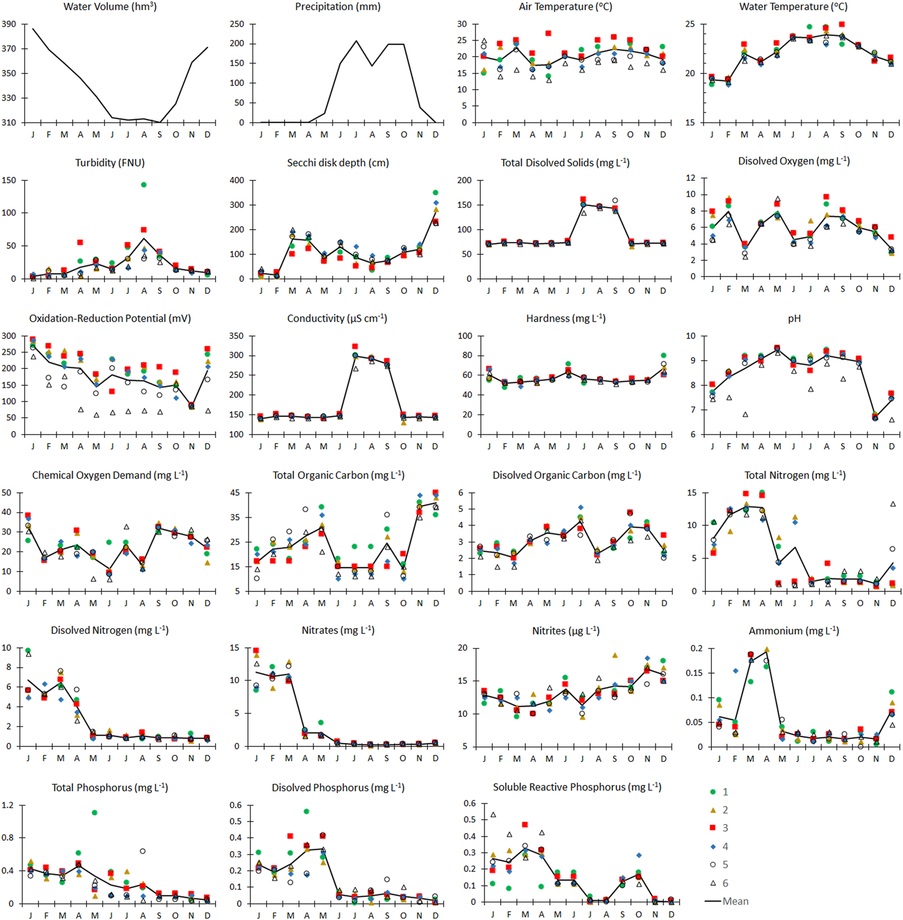 As shown in Figure 2, variations along the year were recorded and differences among sampling points were observed for most parameters. Increases in pH values could be related to the phytoplankton growth during the peaks of primary productivity through the consumption of HCO3−1 (as C source). Dissolved oxygen, COD, DOC, and TOC followed no consistent patterns along the year. Secchi disk transparency was always lower than 2 m, except for December when values higher than 3 m were observed; this low transparency was related with high phytoplankton biomass abundance, typical of the eutrophic condition in this dam.