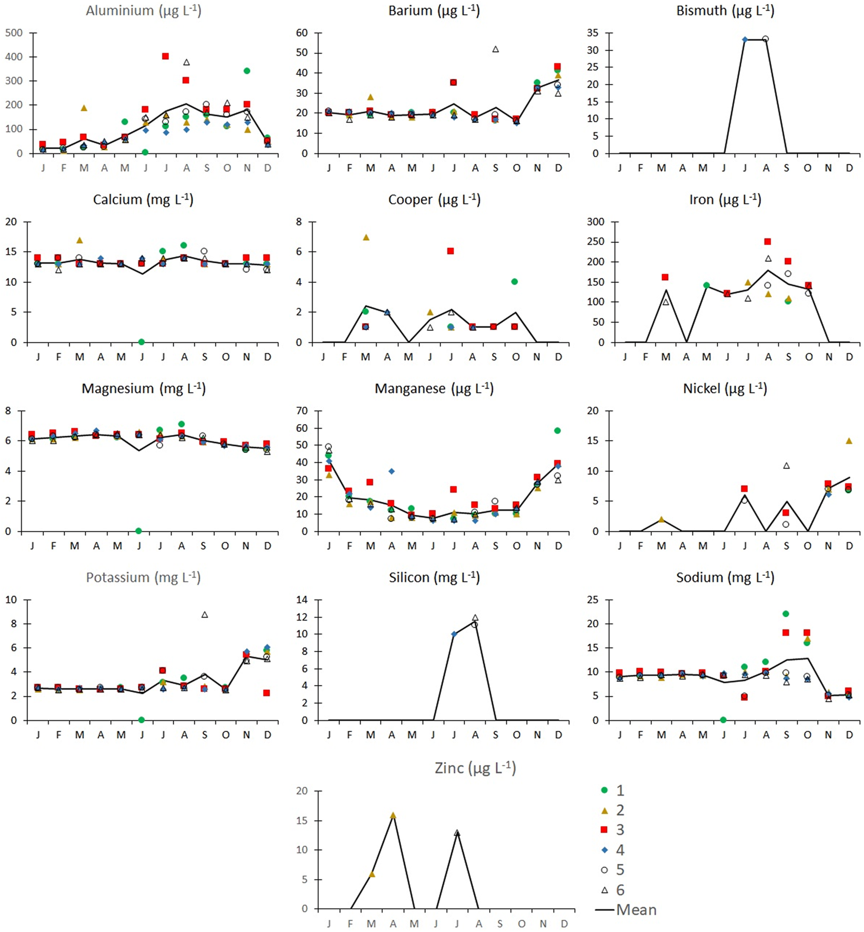 Concentrations of the following metals and metalloids (μg L−1) were measured in surface water: aluminum (Al), barium (Ba), cadmium (Cd), chromium (Cr), cobalt (Co), copper (Cu), iron (Fe), magnesium (Mg), manganese (Mn), molybdenum (Mo), nickel (Ni), zinc (Zn), potassium (K), and sodium (Na). Water samples (125 ml) were collected in HDPE bottles, supplemented with 2% nitric acid (HNO3), transported, and stored at room temperature prior ICP-MS analysis. Total extractable metals were analyzed using standardized procedures by Bureau Veritas Laboratories (Mississauga and Montreal, Canada) accredited to ISO/IEC 17025:2005 using standardized procedures (reference EPA 60208 m).
