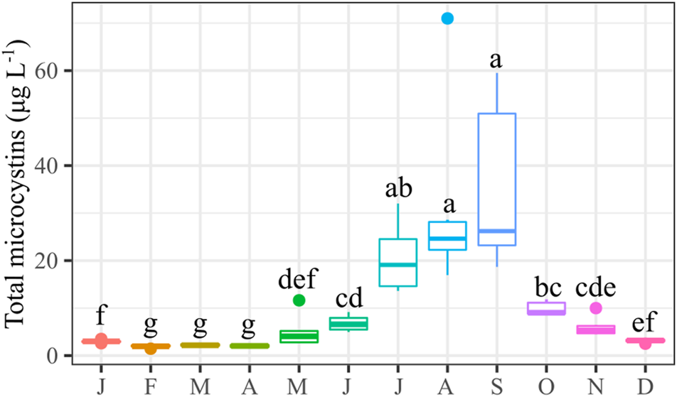 Total microcystins (∑MC, MMPB oxidation method) were detected in all samples, with a concentration range of 1.5–71 μg L−1 (overall average: 11 μg L−1; median: 5.2 μg L−1). A marked seasonality was observed (Figure 4), as the highest microcystin production and highest biovolume occurred in the stratification season months.