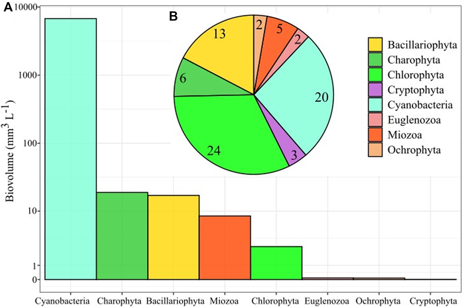 We identified in total 75 phytoplankton species in the Valle de Bravo reservoir belonging to the Divisions Chlorophyta (24), Cyanobacteria (20), Bacillariophyta (13), Charophyta (6), Miozoa (5), Cryptophyta (3), Euglenozoa (2) and Ochrophyta (2). The total biovolume consisted mainly of cyanobacteria (6,766.59 mm3 L−1) while Charophyta (18.94 mm3 L−1), Bacillariophyta (17.12 mm3 L−1), Miozoa (8.46 mm3 L−1) and Chlorophyta (2.71 mm3 L−1) had lower biovolumes. Euglenozoa, Ochrophyta and Cryptophyta were the Divisions with minor contribution to the total biovolume (Figure 5). All the identified phytoplankton species and the specific determined biovolumes are shown in Supplementary Table S2.