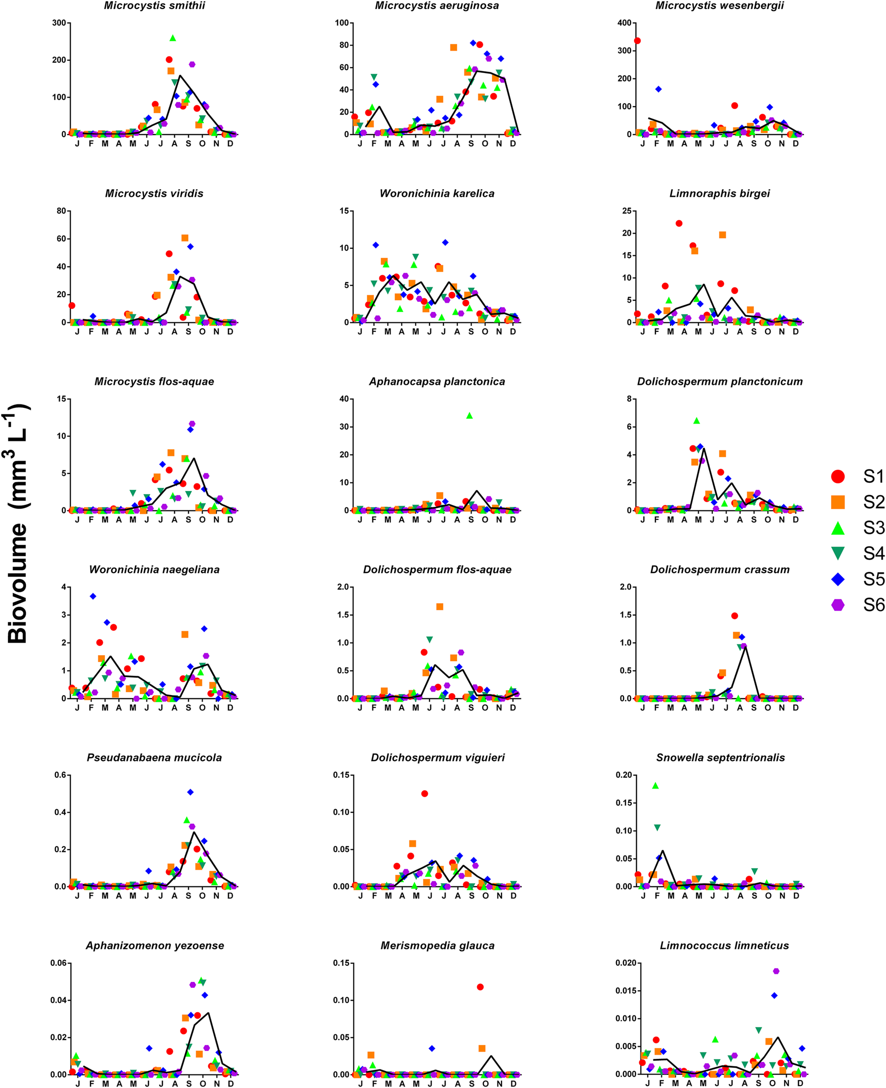 Monthly variations (year of 2019) in the cyanobacterial specific biovolume (mm3 L−1) in Valle de Bravo’s reservoir for the 18 phytoplankton species with the highest total biovolume values in the different sampling points, arranged in decreasing sequence (left to right, up to down). The continuous black lines represent the average values recorded in each month. Color legend represents the site number.