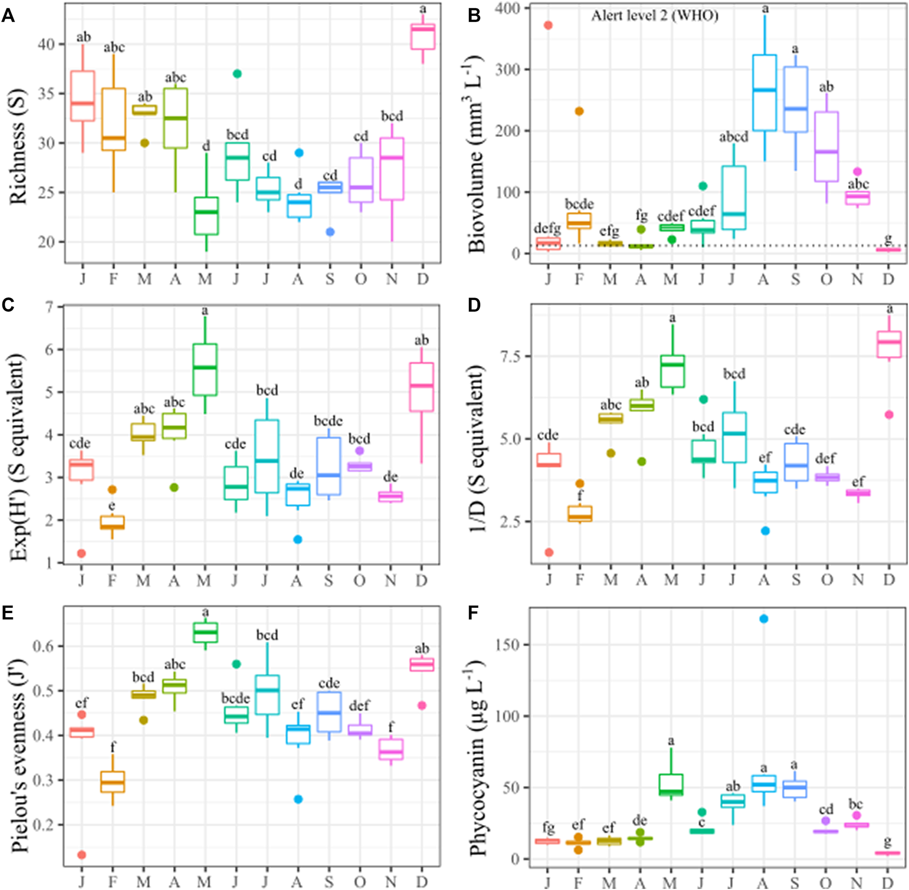Boxplot graphs for phytoplankton diversity patterns in each month along 2019. (A) Species richness (S); (B) Biovolume (mm 3 L−1); (C) Shannon exponential index (Exp(H′)); (D) Simpson inverse (1/D); (E) Pielou’s evenness (J′); (F) Phycocyanin concentration (μg L−1). Kruskal Wallis test and multiple comparisons (p < 0.05).
