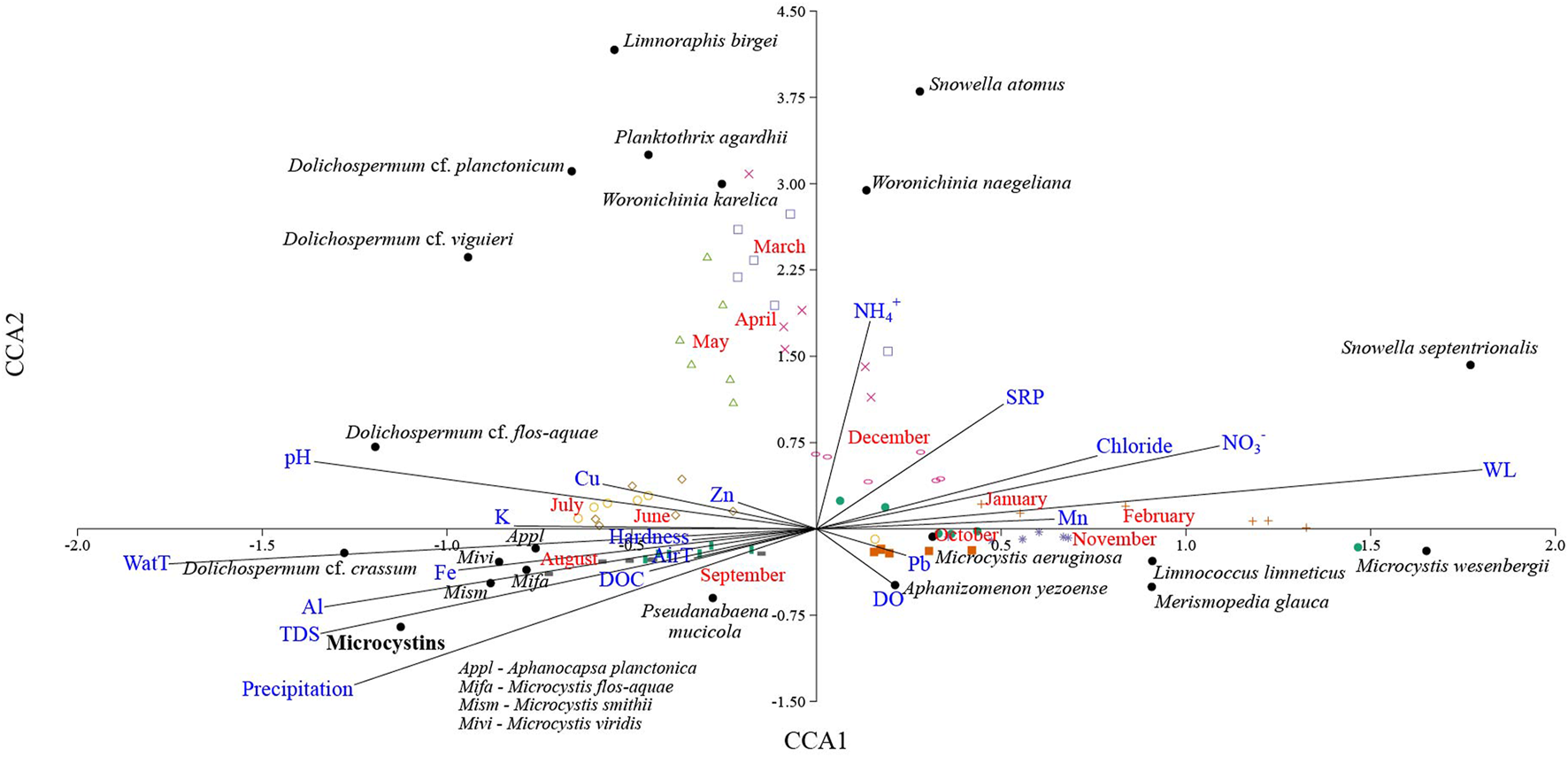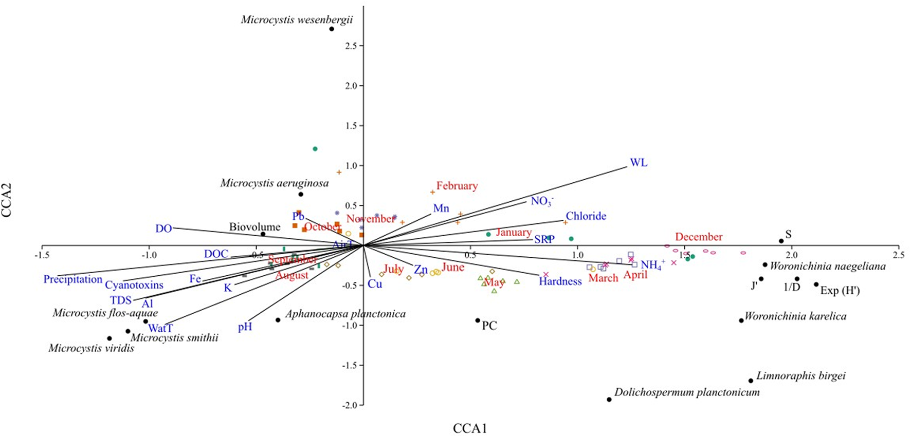 CCA triplot of diversity index, phycocyanin, and specific biovolume regarding abiotic variables and total microcystins in Valle de Bravo’s dam. Months are in red font, diversity index and phycocyanin concentrations in black font, abiotic features in blue font, and cyanobacterial species in italicized black font.