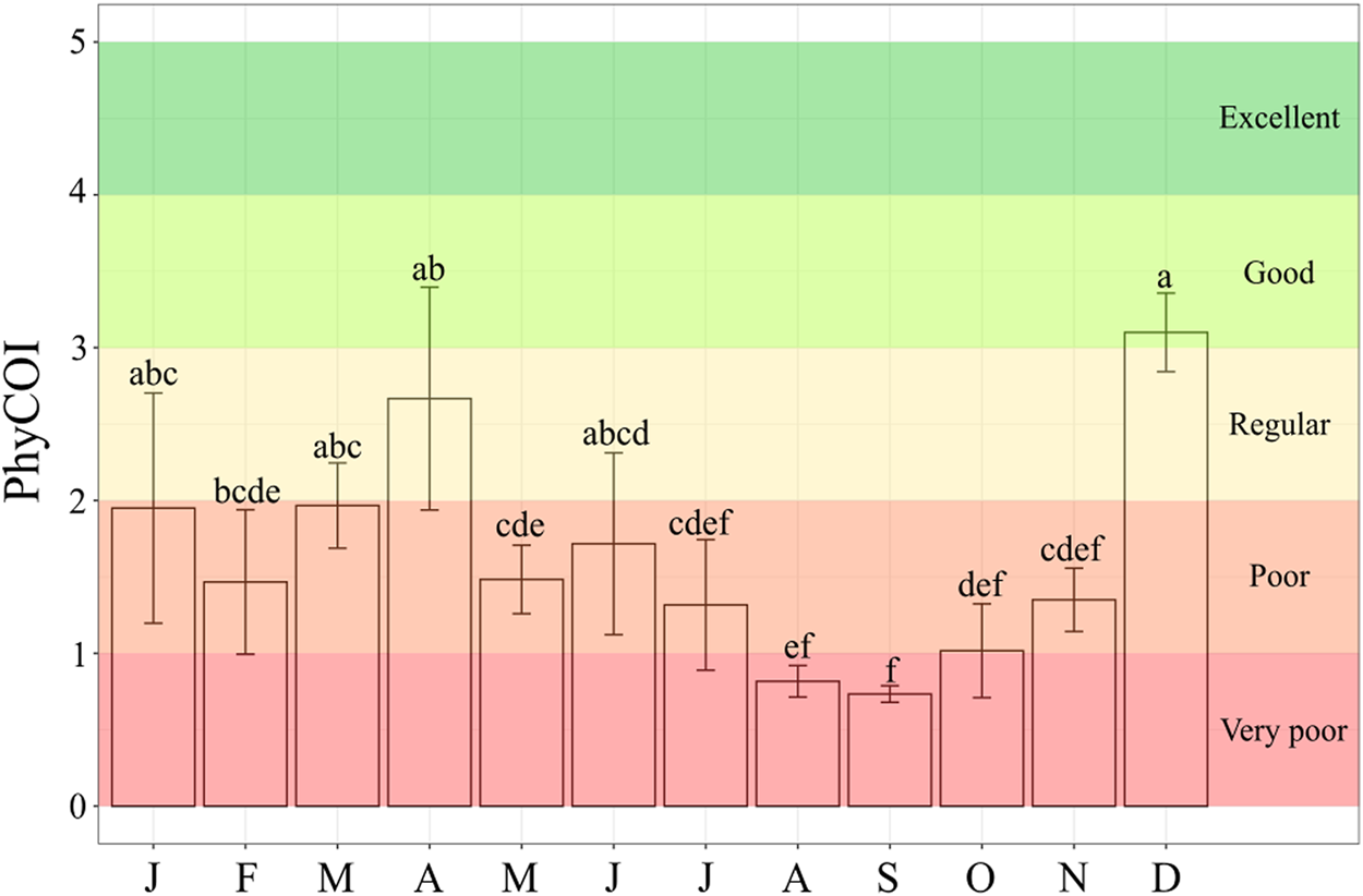 PhyCOI values and water quality classification based on the analysis of the phytoplankton community determined monthly in six sampling points during the year 2019 in Valle de Bravo dam. Average values are included with bars for standard error. Significant differences, after ANOVA and Kruskall-Wallis post hoc tests, are denoted by different letters in each column (p < 0.05).