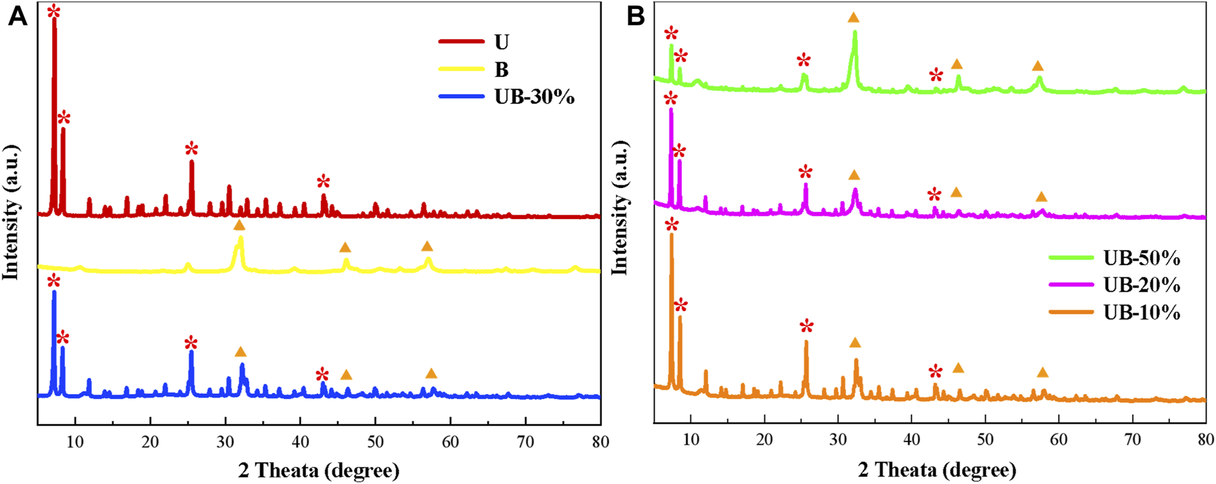 The crystal structure and purity of the photocatalyst were analyzed by XRD. Figure 1 presents the XRD data for the prepared U, B, UB-10%, UB-20%, UB-30% and UB-50%. U and B all show sharp characteristic diffraction peaks, indicating that they possess higher purity. The diffraction peaks of U fit well with previous study, which exhibits characteristic peaks at 7.34â—¦, 8.37â—¦, 25.48â—¦, 43.14â—¦ (Su et al., 2017). The XRD curves of composites all exhibited the major peak features of U, suggesting that the loading of B did not destroy the crystal texture of U framework, the structure of U remained stable during the synthesis of composite photocatalysts. With the increase of BiOBr concentration, the characteristic diffraction peak belonging to UiO-66-NH2 decreases correspondingly. B exhibits the main diffraction peaks at 32.2â—¦, 46.3â—¦and 57.6â—¦, which are attributed to (110), (200), 212) crystal plane (JCPDS 09-0393), respectively. The main diffraction peaks of U and B can be seen in the diffraction pattern of every composite photocatalysts, demonstrating that the successful construction of the composite material.