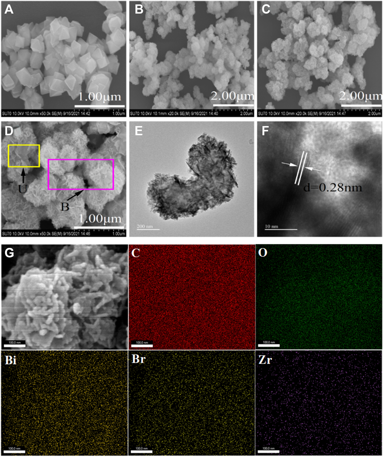 The morphologies of photocatalysts: SEM images of (A) U, (B) B and (C,D) UB-30%; TEM (E) and HRTEM (F) of UB-30%; EDS mapping of UB-30% (G).