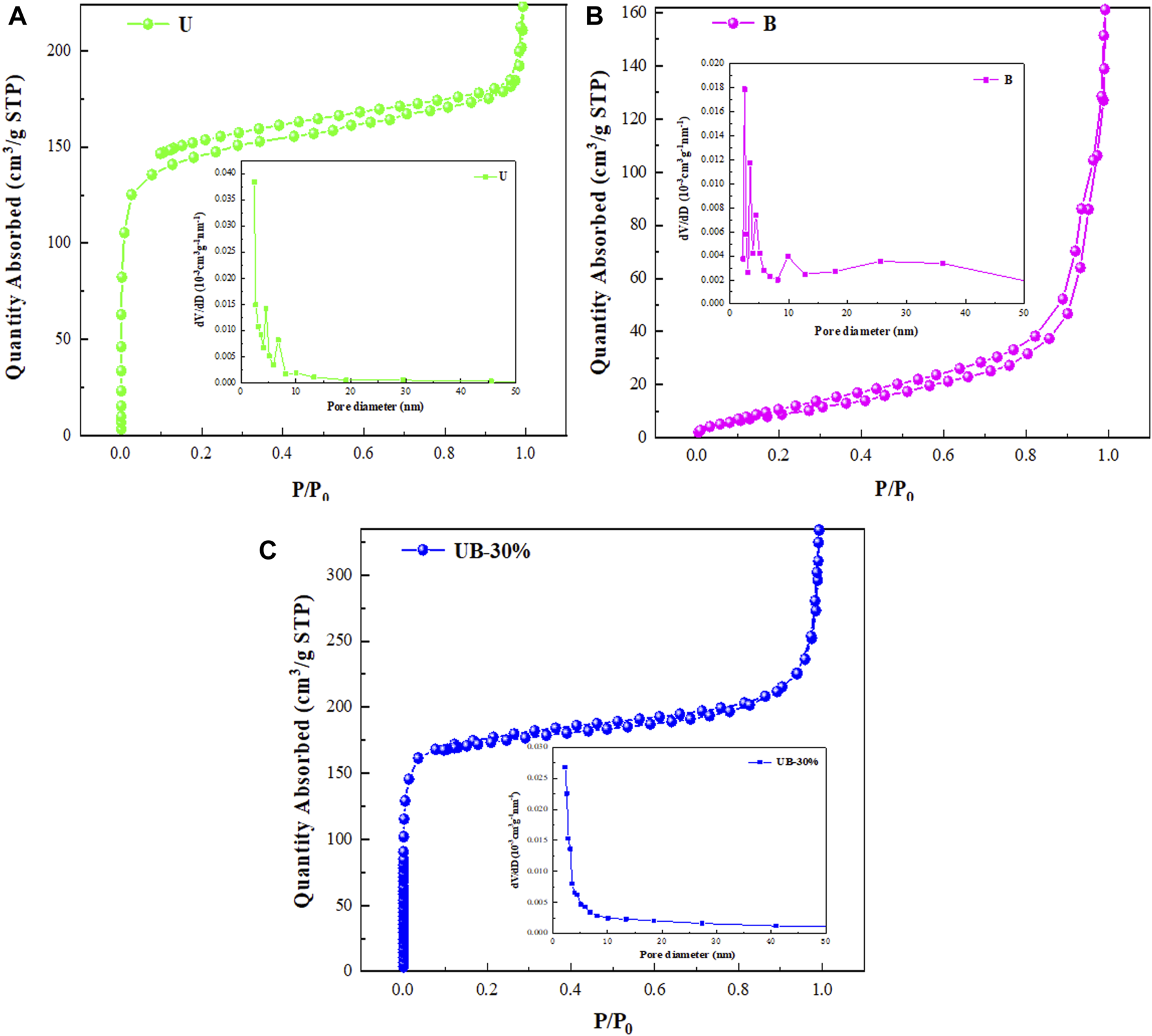 N2 adsorption-desorption isotherm and aperture distribution of U (A), B (B) and UB-30% composite (C).