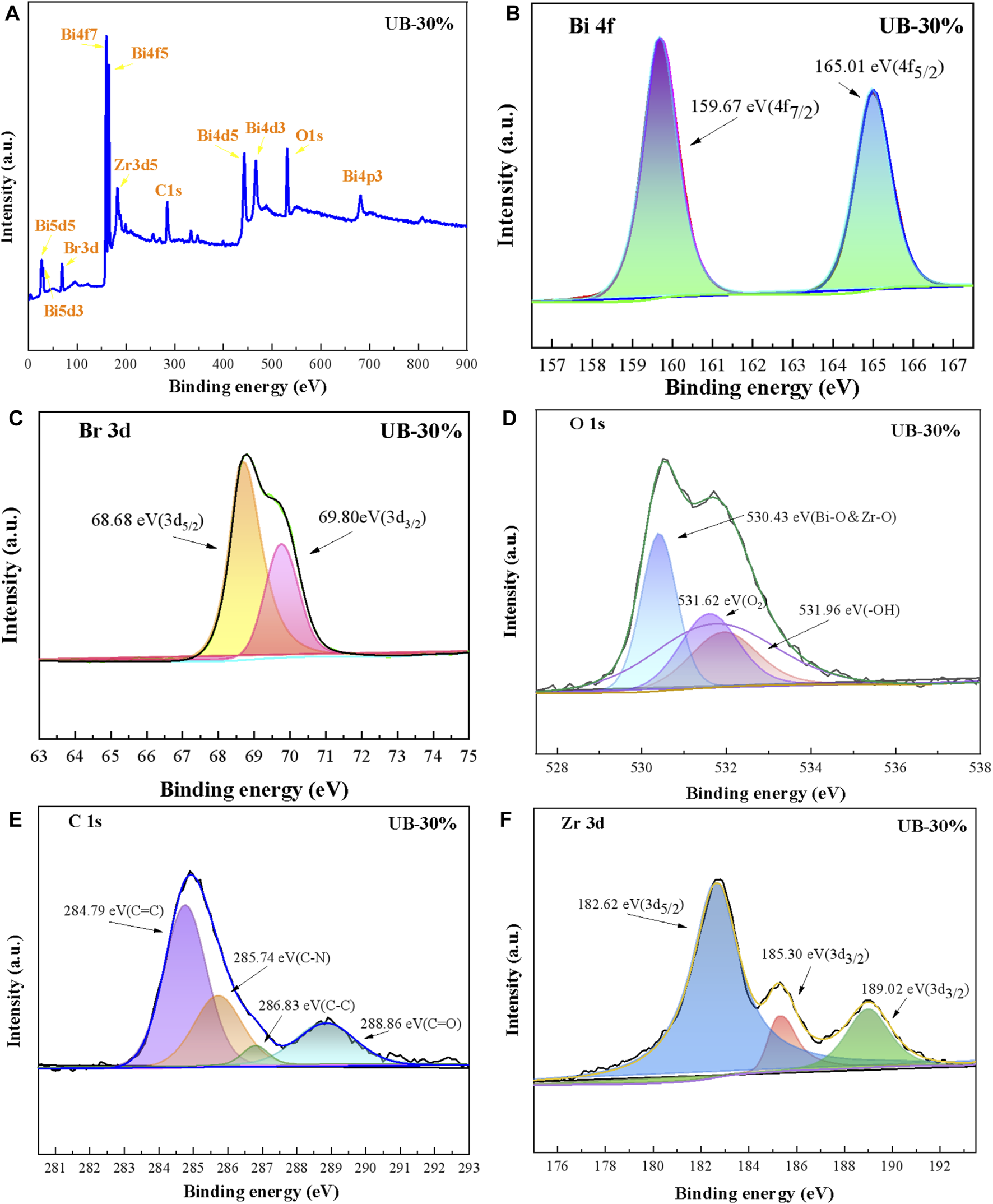 XPS spectra of UB-30% (A) the full spectrum of UB-30%; the spectra of UB-30%: (B) Bi 4f; (C) Br 3d; (D) O1s; (E) C1s; (F) Zr 3d.