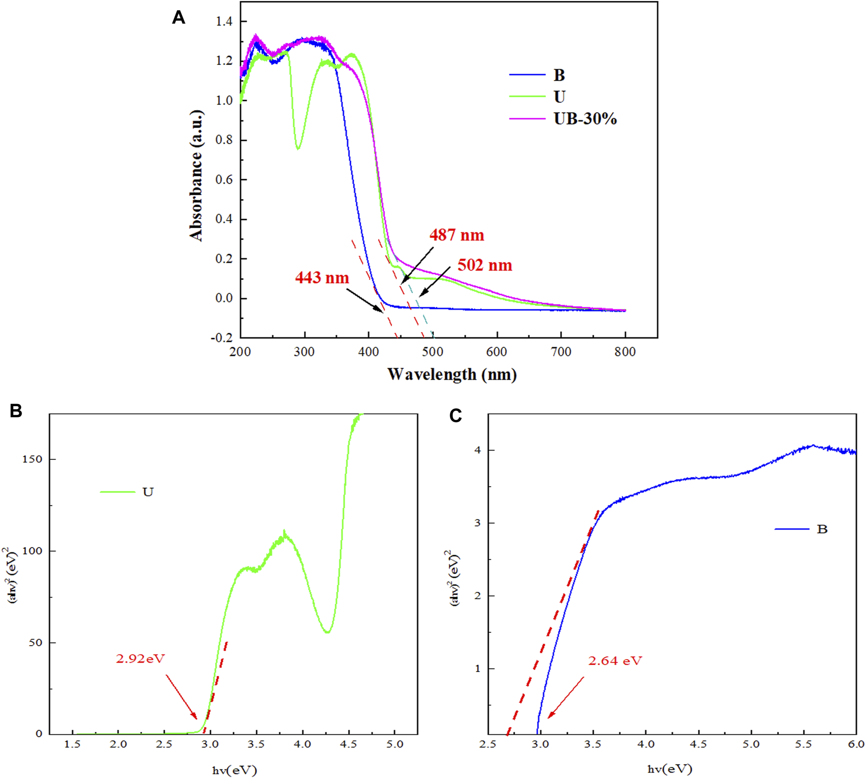 (A) UV-vis DRS of U, B and UB-30% composites; the bandgap energies of U (B) and B (C) versus the light energy.