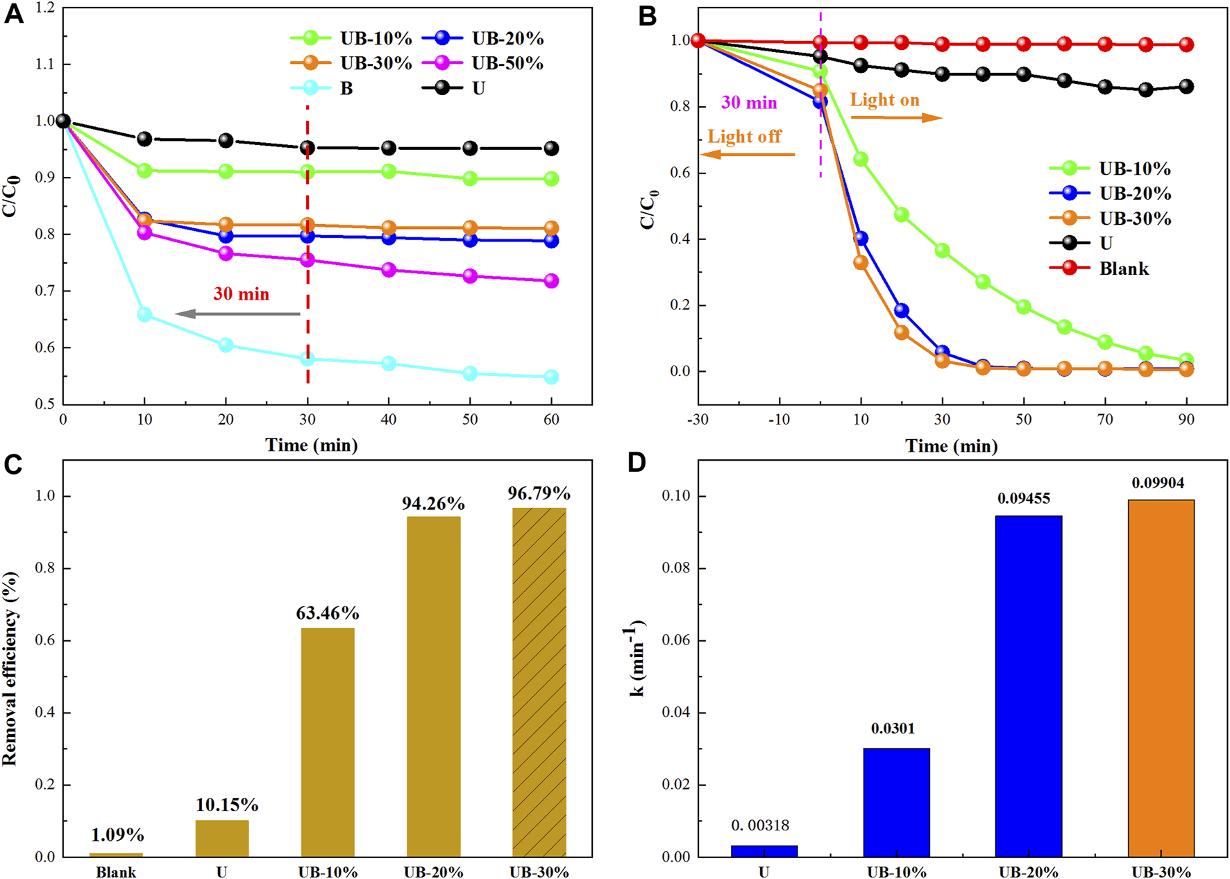 Before the photodegradation experiment, dark adsorption experiment was conducted for different samples for 1Â h (Figure 6A). It can be seen that B and composite UB-50% have strong adsorption effect on RhB, and the adsorption equilibrium is not reached in 1Â h. Combined with the SEM and pore analysis results above, the reason for the strong adsorption capacity of B may be due to its unique 3D nanosphere structure. A large number of nanosheets are piled up to cause a large number of gaps and enhance their adsorption capacity. It is well known that the removal of RhB is achieved by adsorption and photocatalytic degradation, but photocatalytic process accounts for a larger proportion. If the dark adsorption is not close to equilibrium, there will be great interference for the subsequent determination of photodegradation efficiency. However, UB-X% (X = 10, 20, 30) can quickly reach the dark adsorption equilibrium of pollutants within 30min, the whole reaction time was shorten. It proved that U in the three composites effectively inhibited the adsorption capacity of B (Figure 6A), which is consistent with the results of pore size analysis and further proves that the two substances successfully combined to form a heterojunction. Meanwhile, the interference of B adsorption on the determination of light degradation ability of composite was eliminated. After determining the equilibrium time of adsorption and desorption by dark adsorption experiment, the removal efficiency of RhB by U and UB-X% (X = 10, 20, 30) were studied under simulated visible light irradiation (Figure 6B). When the prepared photocatalysts were added to the solution under visible light, RhB concentration decreases significantly, which indicates that they all had excellent visible light photocatalytic activity. RhB concentration not decreases significantly in the absence of catalyst (Blank), indicating that the self-degradation of RhB could be ignored. After dark adsorption, photocatalytic test was carried out for 90 min, and the removal rate of U is 13.86%. The photocatalytic activity of UB-X% (X = 10, 20, 30) are significantly higher than that of U, which improves the photocatalytic performance of U. Combined with dark adsorption experiments, it can be concluded that UB-30% is the best catalyst, which has less adsorption capacity for RhB and the highest photodegradation efficiency for RhB. Under visible light irradiation for 30min, the removal rate of UB-30% on RhB reached 96.79%, and that of 90min reached 99.37%, indicating that the dye was almost completely degraded, which was 7-fold greater than that of U. As can be seen in Figure 6C, the removal effects of U and UB-x % (X = 10, 20, 30) on RhB within 30min of visible light irradiation were compared, and it was more intuitive to compare that UB-30% had the best degradation effect on RhB within a short time of visible light irradiation.
