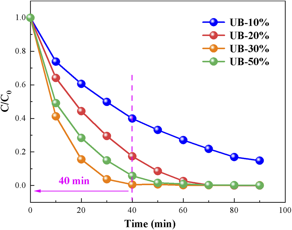 According to the above studies, the prepared composite materials had excellent visible light response ability, and had a strong degradation ability to RhB in the conventional photocatalytic degradation reaction process. However, the reaction time of conventional photocatalytic reaction is too long, which is not conducive to the practical application of photocatalyst. Therefore, this study attempted to abandon the dark adsorption stage and directly carried out the photocatalytic reaction under visible light, to investigate whether UB-X% (X = 10, 20, 30,50) can efficiently and rapidly degrade RhB under a short time of visible light irradiation. As can be seen from Figure 8, under direct visible light irradiation, UB-X% (X = 10, 20, 30,50) showed excellent RhB removal ability. Among them, UB-30% can remove 99.43% RhB after visible light irradiation for only 40min, so as to achieve the purpose of efficient and rapid degradation of pollutants in a short time. In addition to UB-30%, the removal rate of UB-X % (X = 20,50) can also rearch more than 95% after visible light irradiation for 60min. Compared with the other three composite materials, the removal ability of UB-10% on RhB is poor, which may be due to the lack of photogenic electron holes, U and B do not reach a good coupling degree, resulting in the ability of heterojunction to inhibit e−-h+ recombination was limited.