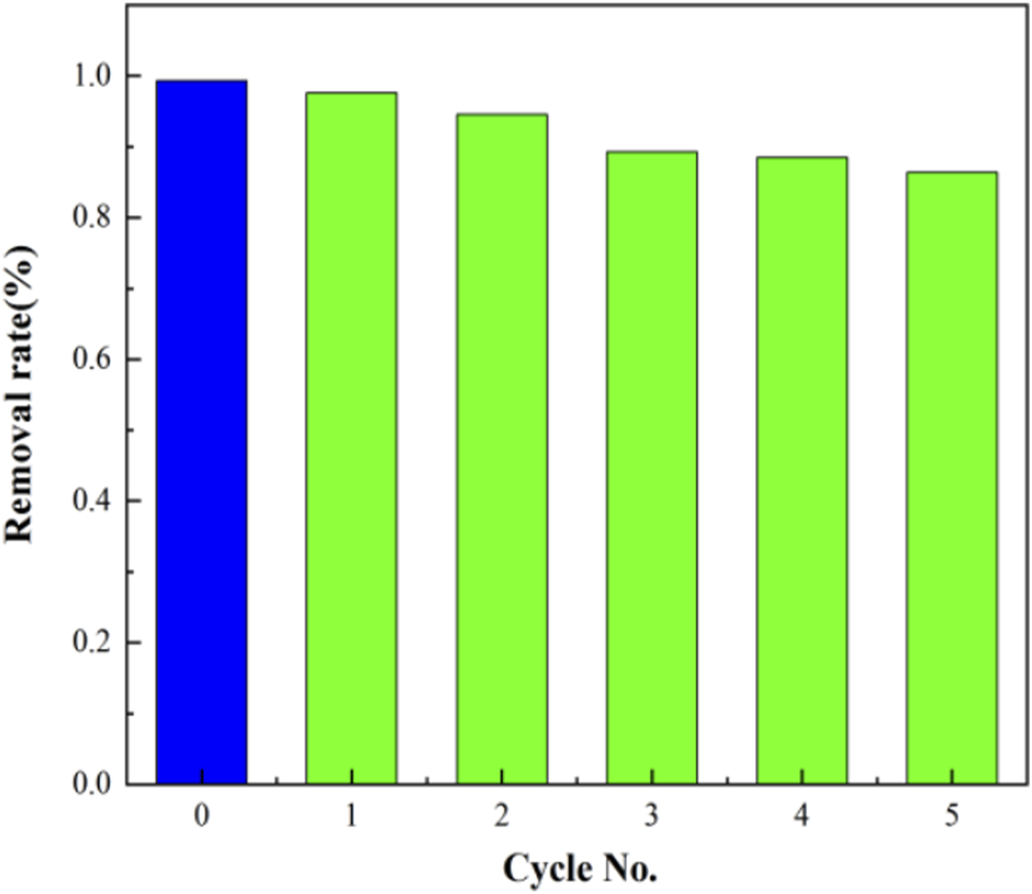 It is very important for a photocatalyst to have stability during recycling, which will affect the application of the catalyst in practical conditions. In order to explore the reusability of photocatalyst, five cycles were carried out. Before the experiment, the catalyst UB-30% participating in the photocatalytic reaction process was regenerated, mainly using ethanol for ultrasonic washing, drying in the oven at 90°C for 24 h, and the regenerated catalyst was used in the new photocatalytic degradation experiment of RhB. All other experimental conditions remained unchanged. As shown in Figure 9, the photodegradation efficiency of RhB in the first cycle after the reaction is 97.66 and 77.39% after five cycles, indicating that the photocatalyst has good reusability as a whole.