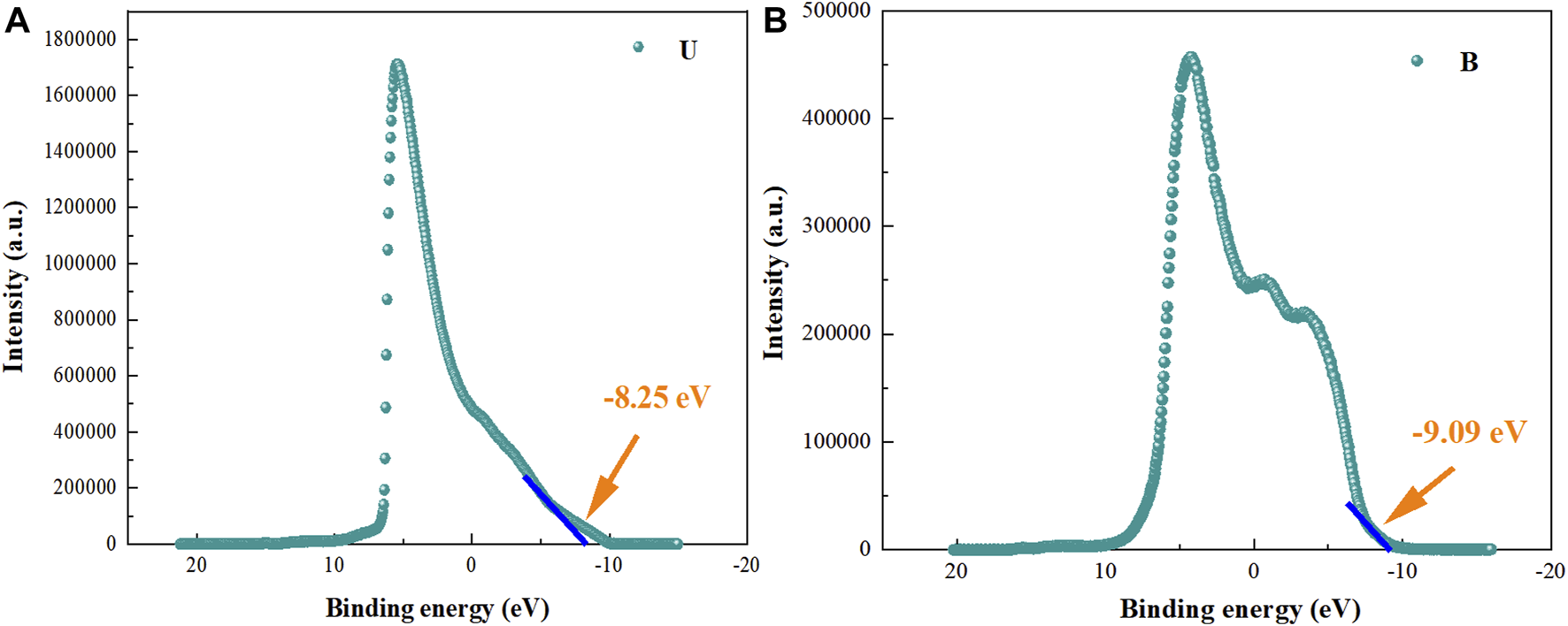 Figures 10A,B shows the UPS results for U and B. The work functions of U and B were -5.76Â eV and -6.42 eV, respectively. The distances between the valence band (EVB) position of U and B and the work function were -8.25Â eV and -9.09 eV, respectively. Therefore, the HOMO potential of U and EVB potential of B were estimated to be +2.49Â eV and +2.65 eV, respectively. The conduction band (ECB) potentials of the photocatalysts could be deduced by the following Eq. 4where EV and EC are the corresponding EVB and ECB potential values. The LUMO potential of U and ECB potential of B were -0.43Â eV and +0.01Â eV respectively. U and B possessed overlapping band potentials, implying that the two materials can be matched to synthesize a valid heterojunction.