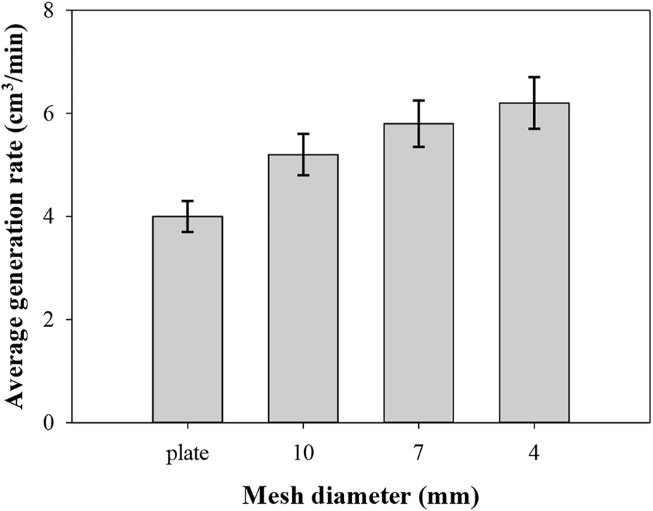 In this study, we considered the rate of microbubble generation as one important factor in choosing the suitable electrode for the experiment (Burns et al., 1997; Brasileiro et al., 2021). The plate and three types of mesh were tested for microbubble generation. In electro-flotation, three stages occur during gas evolution: nucleation, growth, and detachment. Generated microbubbles come from spots on the surface of the electrode called the nucleating sites, where the evolution of microbubbles takes place (Lucero et al., 2018). The number of these sites is more likely dependent on the surface area of the electrode. The more the surface area, the more nucleation sites are activated, which increases the microbubble generation rate.