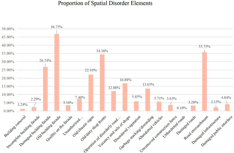 According to the evaluation results, from the perspective of five categories of first-class indicators, buildings in the elements of spatial disorder in the old urban area of Daoli District of Harbin City account for the largest proportion, indicating that the dilapidated commerce along the street in this area is the most serious (Figure 4). From the subdivided 19 secondary indicators, building facades, encroached roads, and old and dirty road surfaces become the top three most frequent elements of spatial disorder. The primary concerns in the process of improving and upgrading the space quality of the old urban area of Daoli District of Harbin City reflect the urgent need to carry out maintenance, repair, and organic renewal of the dilapidated, damaged, and chaotic buildings of the old urban area of Daoli District of Harbin City. However, in the evaluation of space health in the old urban area of Daoli District of Harbin City, the two disorder elements, namely, the damage to building facades and the old and chaotic signs, happen in a certain frequency, resulting in the urban landscape of dilapidated building planes in the old urban area of Daoli District of Harbin City.
