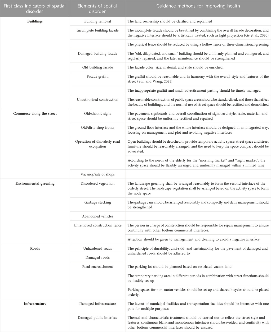 Research on urban space health is the top priority in China because China has already entered a certain development level and is transforming from “quantity” to “quality” development (Chen et al., 2020). In order to build a living environment conducive to public health and meet the demands of public health for urban space, the local decision-makers need to decide on the built environment that can guide and respond to how to improve the rate of street health and solve the problem of spatial disorder (Zhou et al., 2022).