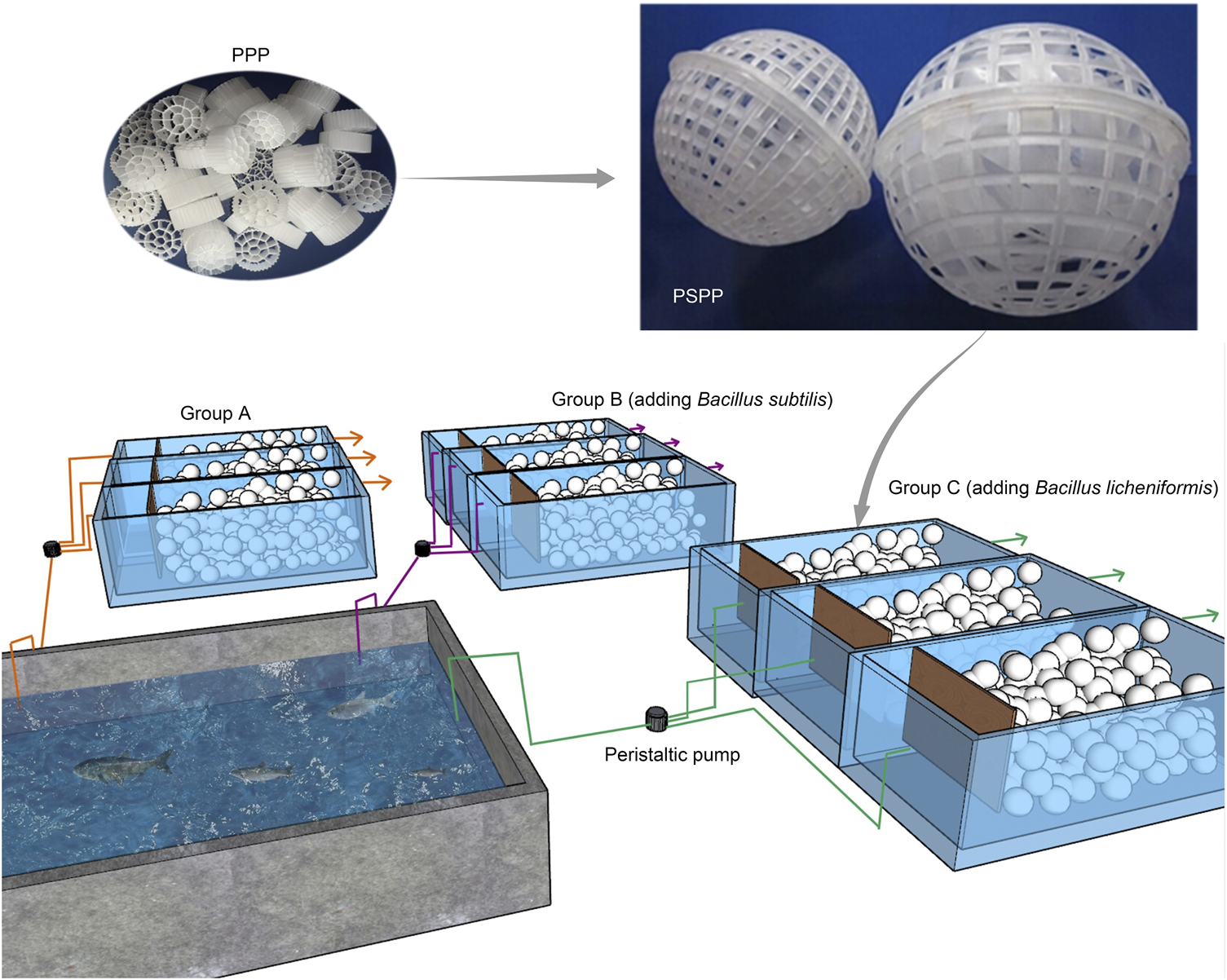 The experimental device included a small grass carp culture pond (2 × 2 × 1.5 m) and three groups of cuboid reactors, with an effective volume of approximately 61 L (50 × 35 × 35 cm) (Figure 1). There were 25 individuals grass carp in the culture pond. The initial average body weight of the grass carp was 0.35 ± 0.07 kg. The fish were fed with commercial feed (approximately 30% crude protein) at 9:00 and 16:00 each day. Fish were given approximately 1.5%–2.5% of their own weight in feed each time. The packing ratio of the three biofilm purification reactors was 55%. The packing in the reactors consisted of porous polyethylene (PPP; Figure 1) and porous spherical polypropylene (PSPP; Figure 1). The PSPP was a sphere with a diameter of 8 cm (Figure 1), and the PPP was a polyhedral column with a diameter of approximately 20 mm and a height of approximately 30 mm (Figure 1). Each PSPP sphere was packed using 20 PPP and each reactor was packed using 40 PSPP spheres, which were covered with a pressure net to fix the PSPP spheres at the bottom of the reactor. The wastewater from the aquaculture pond was pumped into the reactors through peristaltic pumps, with inlet and outlet-flow of 0.2 L/min. The theoretical hydraulic retention time was 5.4 h. The reactors were continuously exposed to air.