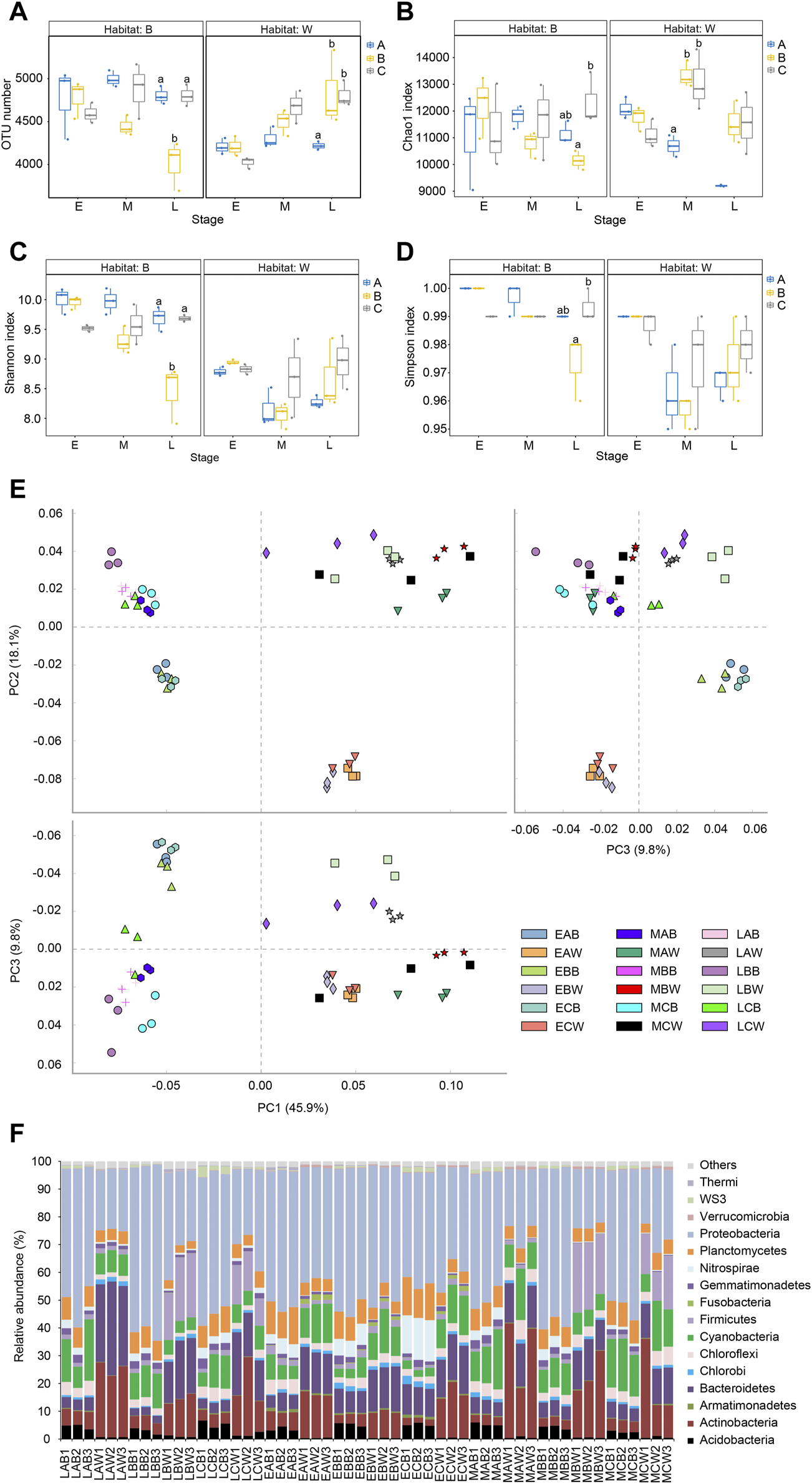 Alpha diversity indices and dominant phyla of water and biofilm of reactor packing microbiota. Group A is a natural biofilm group, and its biofilm was formed on the surface of the packing after the wastewater from the aquaculture pond continuously entered the reactors. Groups B and C are enhanced biofilm groups. In addition to providing aquaculture wastewater as in the group A reactors, 2.5 g of B. subtillis and B. licheniformis preparations was added to the two groups of devices every 3 days. Water (W) and biofilm of reactor packing B samples were collected at the early (E, 0 days after the start of experiment), middle (M, 21 days), and late (L, 42 days) stages of the experiment for microbiota composition analysis. (A) OTU number; (B) Chao index; (C) Shannon index; (D) Simpson index; (E) principal component analysis profile; (F) Composition of dominant phyla. Distinct letters above the boxes indicate significant differences (p < 0.05).