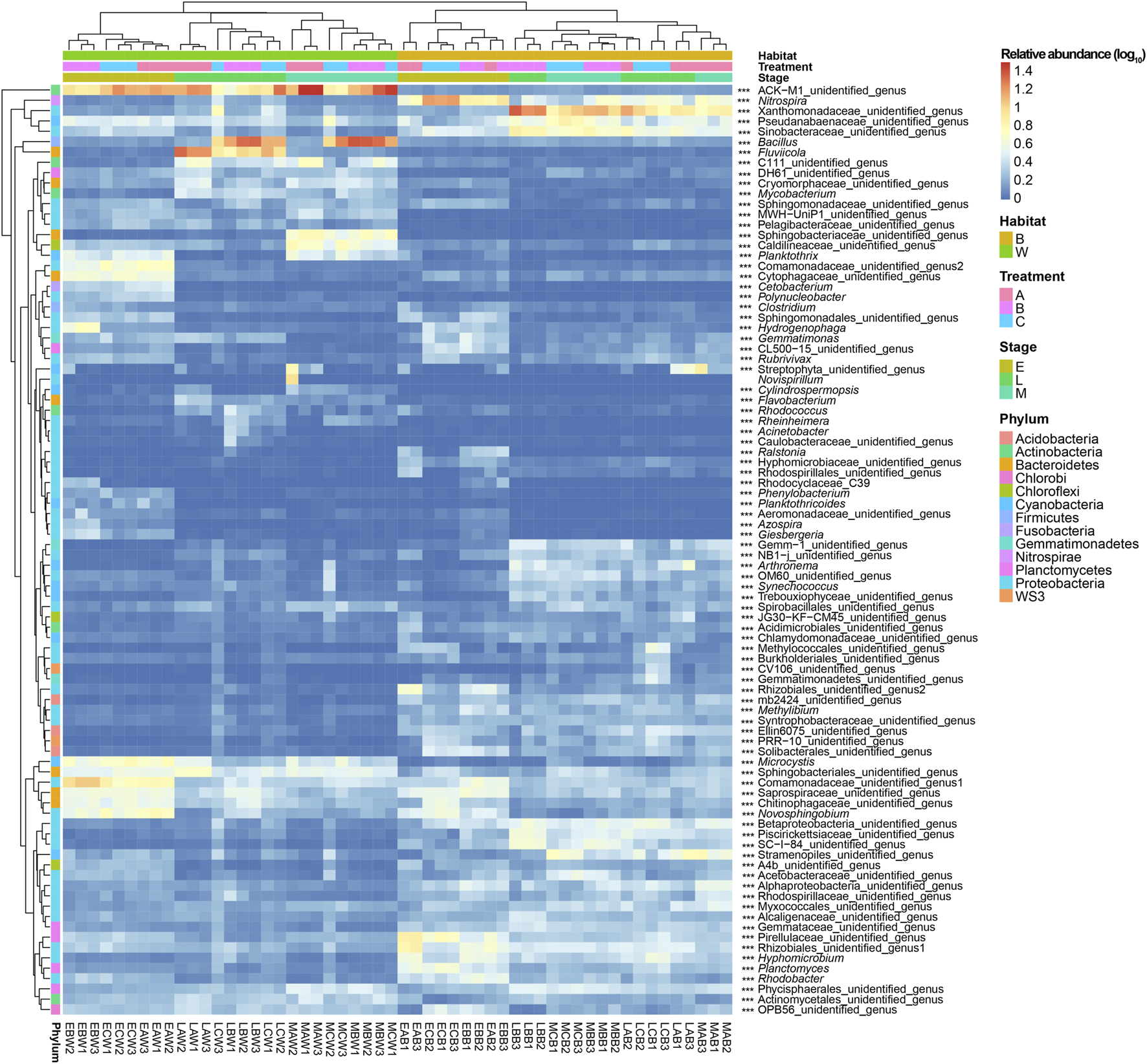 Dominant genera of dominant phyla of water and biofilm of reactor packing microbiota. Group A is a natural biofilm group, and its biofilm was formed on the surface of the packing after the wastewater from the aquaculture pond continuously entered the reactors. Groups B and C are enhanced biofilm groups. In addition to providing aquaculture wastewater as in the group A reactors, 2.5 g of B. subtillis and B. licheniformis preparations was added to the two groups of devices every 3 days. Water (W) and biofilm of reactor packing B samples were collected at the early (E, 0 days after the start of experiment), middle (M, 21 days), and late (L, 42 days) stages of the experiment for microbiota composition analysis. *** p < 0.001.