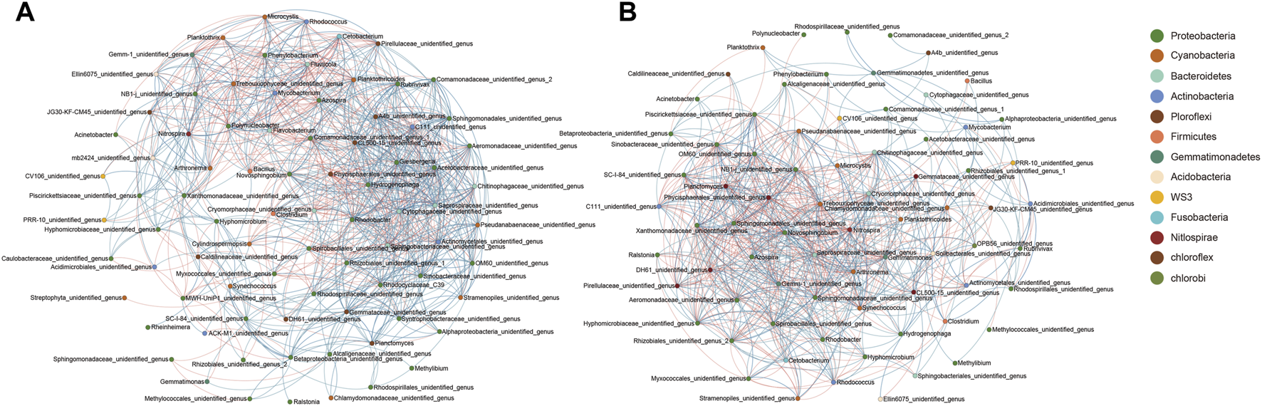 Co-occurrence networks showing the correlation between dominant genera in water (A) and reactor packing (B). The correlations with Spearman coefficient >0.6 and p < 0.05 are considered as significant. Orange and blue indicate significant negative and positive correlations, respectively.