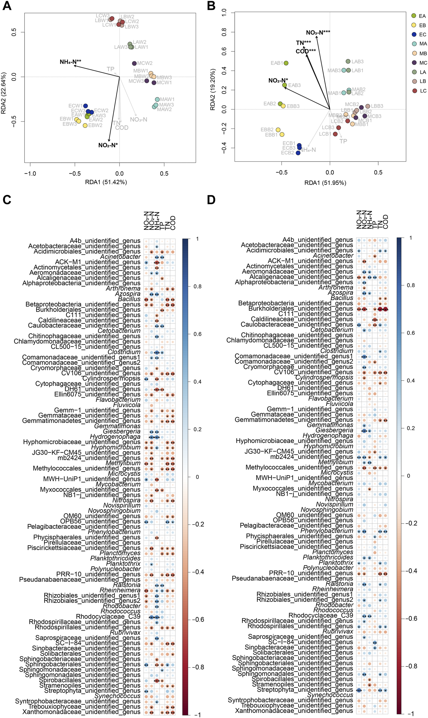 Correlation between water physicochemical parameters and both water and biofilm of reactor packing microbiota. (A) RDA profile showing correlation between water physicochemical parameters and water microbiota; (B) RDA profile showing correlation between water physicochemical parameters and biofilm microbiota; (C) Bubble chart showing correlation between water physicochemical parameters and water dominant genera; (D) Bubble chart showing correlation between water physicochemical parameters and biofilm dominant genera. Group A is a natural biofilm group, and its biofilm was formed on the surface of the packing after the wastewater from the aquaculture pond continuously entered the reactors. Groups B and C are enhanced biofilm groups. In addition to providing aquaculture wastewater as in the group A reactors, 2.5 g of B. subtillis and B. licheniformis preparations was added to the two groups of devices every 3 days. TN, total nitrogen; TP, total phosphorus; COD, chemical oxygen demand. Water (W) and biofilm of reactor packing B samples were collected at the early (E, 0 days after the start of experiment), middle (M, 21 days), and late (L, 42 days) stages of the experiment for microbiota composition analysis. * p < 0.05; ** p < 0.01; *** p < 0.001.