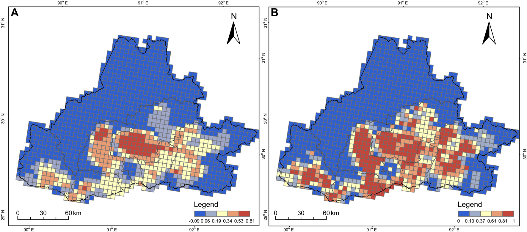 The study area was divided into 5,000 × 5,000 m fishing net units, and the proportion of cultivated land and WRSIA in each unit was measured. Figure 9 shows the correlation results between WRSIA and cultivated land. Specifically, Figures 9A, B show the spatial distribution of the regression coefficient and correlation coefficient (r), respectively. The overall correlation was strong (0.904). In the southern Lhasa River and its tributary valleys, the regression coefficients were positive, and the correlation coefficients were >0.6, thus, indicating a significant positive correlation. Thus, WRSIA could strongly interpret the spatial distribution of cultivated land. In the northern mountains and Dangxiong Basin, the correlation was weak because cultivated land is sparse, and the temperature could not meet the requirements of agricultural production.
