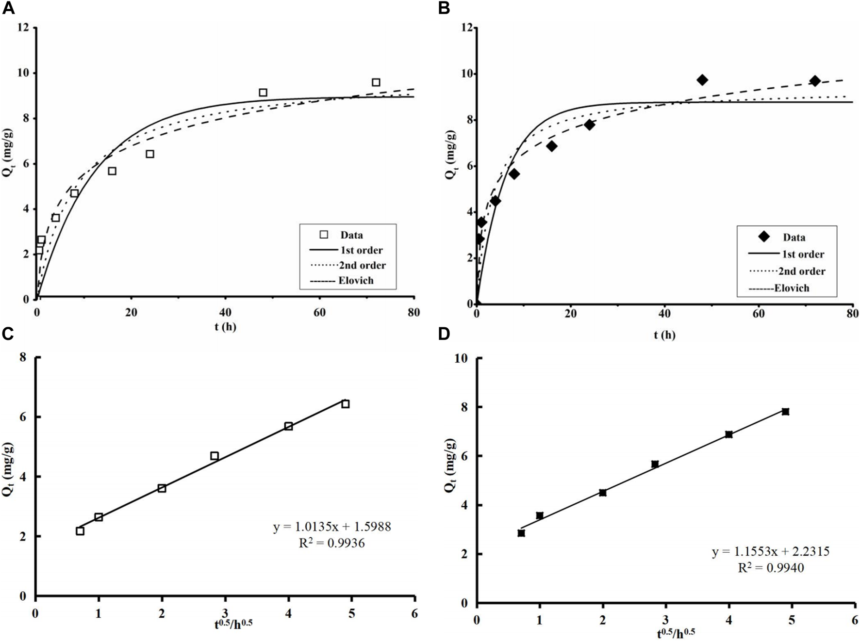 | Second-order | k2 = 3.133 × 10−2 g/(mg h) | Qe = 9.406 mg/g | 0.9016 | ||